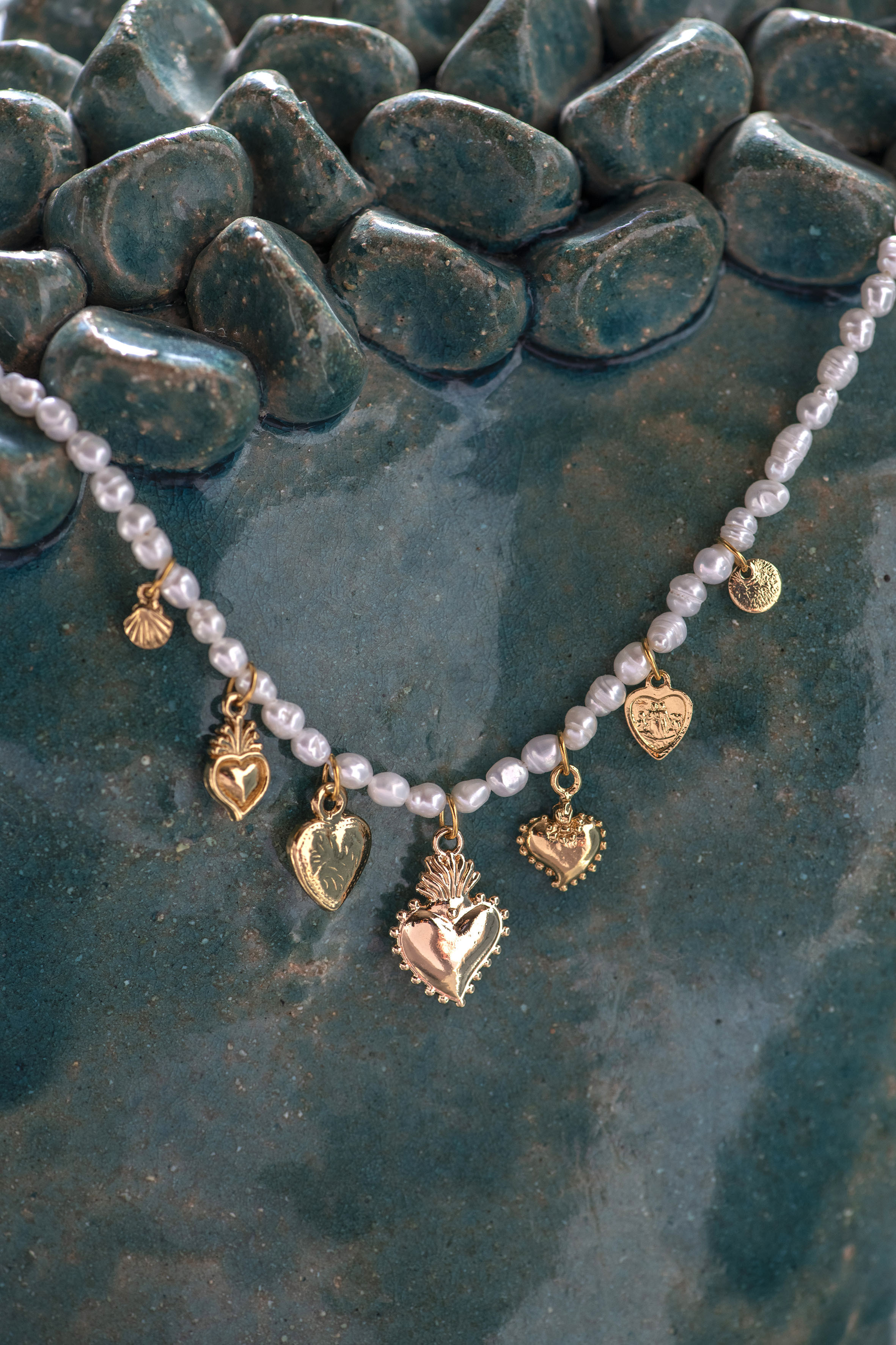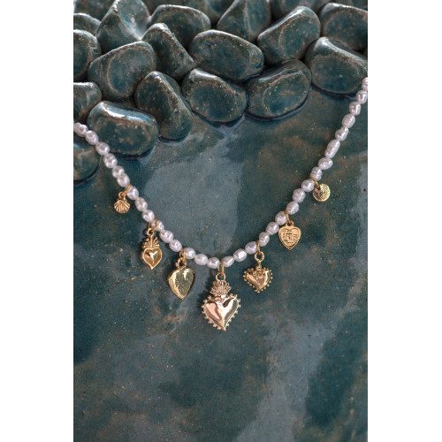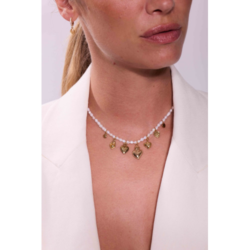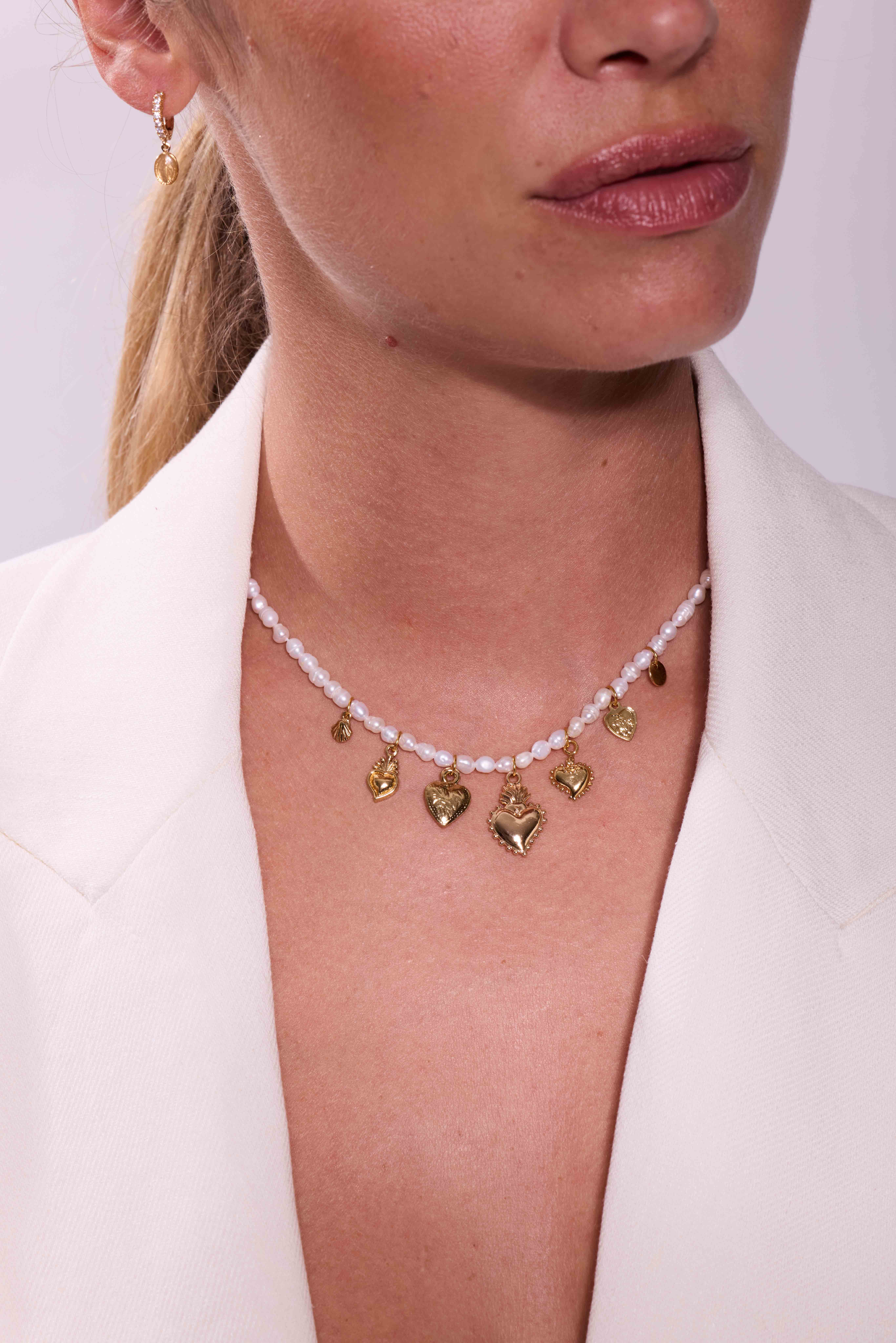 Le collier Jett se compose d’un rang de perles de culture, sur lequel sont disposées avec délicatesse plusieurs médailles symboliques : une coquille, un ex-voto, un cœur de lumière et une petite médaille ronde.