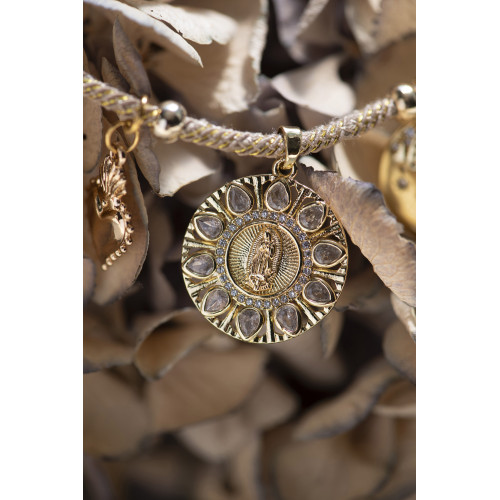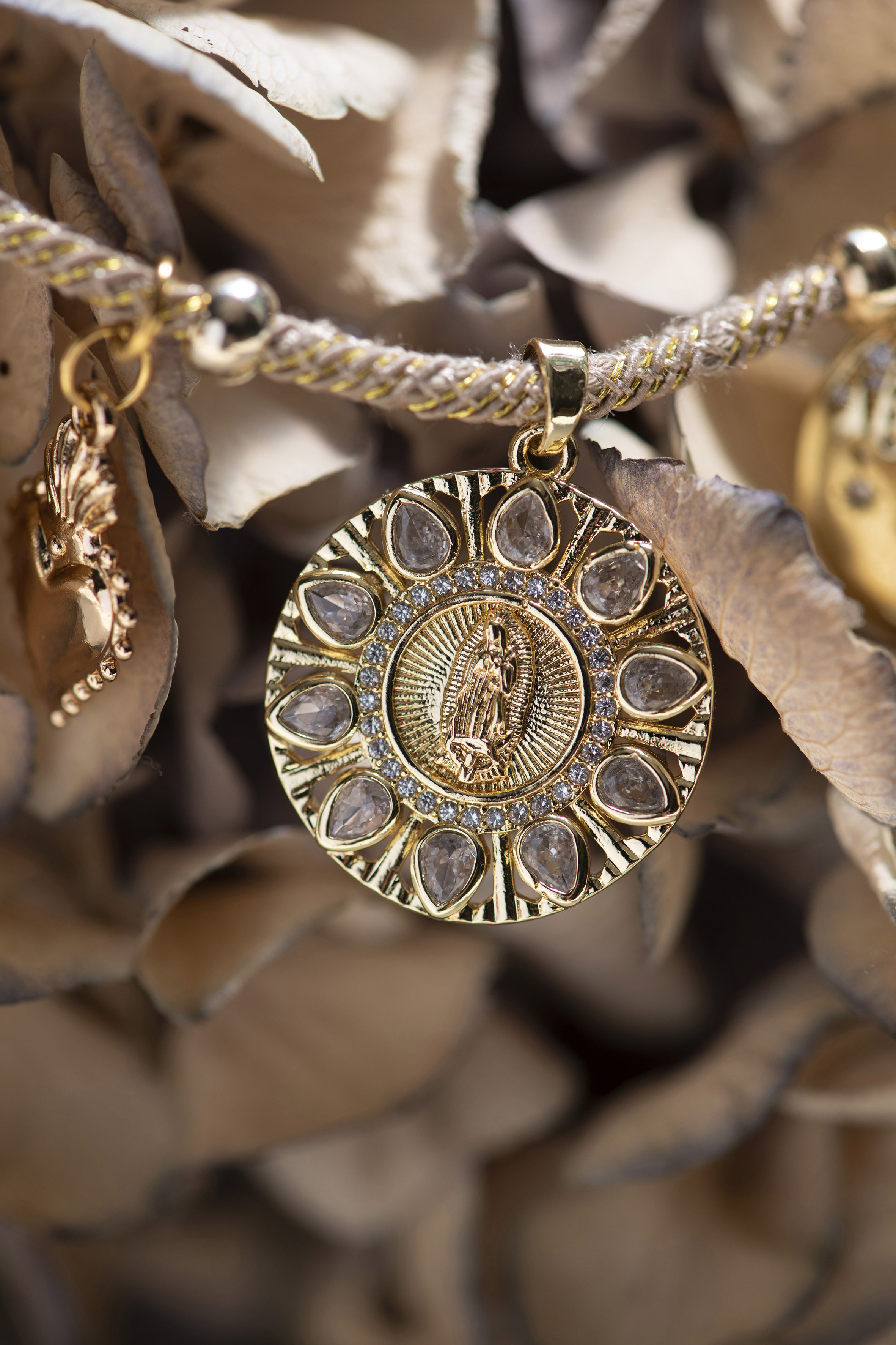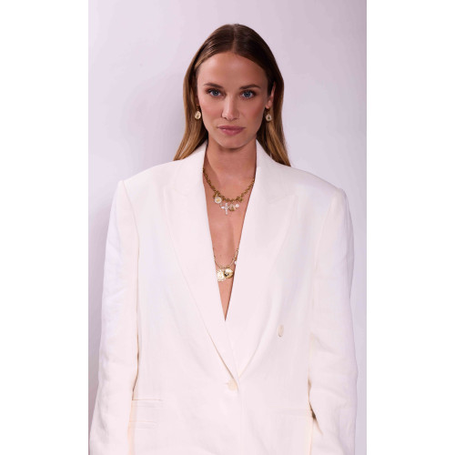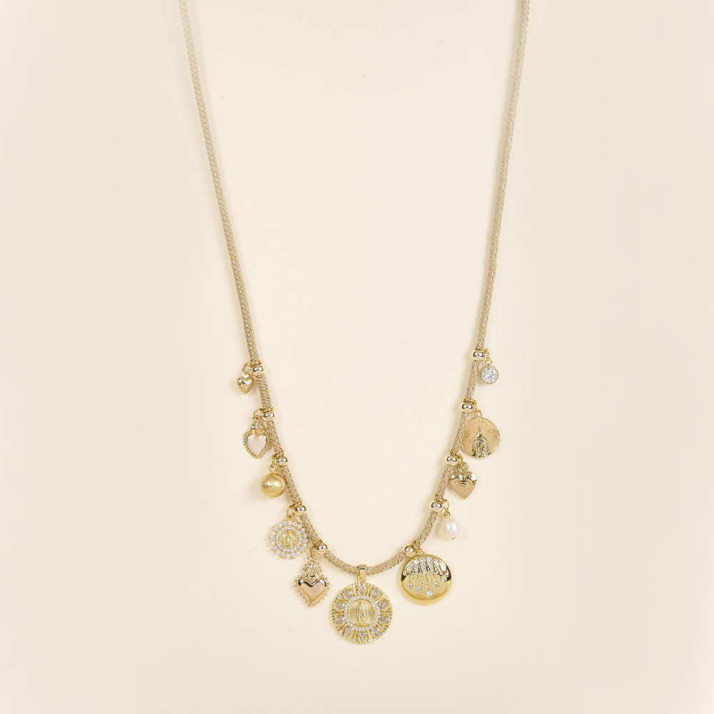 Le collier Jina est sans doute la pièce la plus spectaculaire de la collection Rome. Ce sautoir se compose d’un large cordon sur lequel sont enfilées et entrelacées une multitude de médailles porte-bonheur, toutes sélectionnées avec soin. Certaines sont émaillées dans notre atelier, d'autres serties d’oxydes de zirconium, créant un jeu de textures et de reflets captivant.