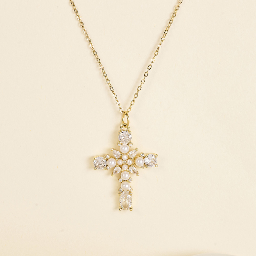 Le collier Joël Croix Perlée associe la douceur des perles et la brillance des zircons. Sa croix dorée, délicatement travaillée, allie élégance classique et modernité.