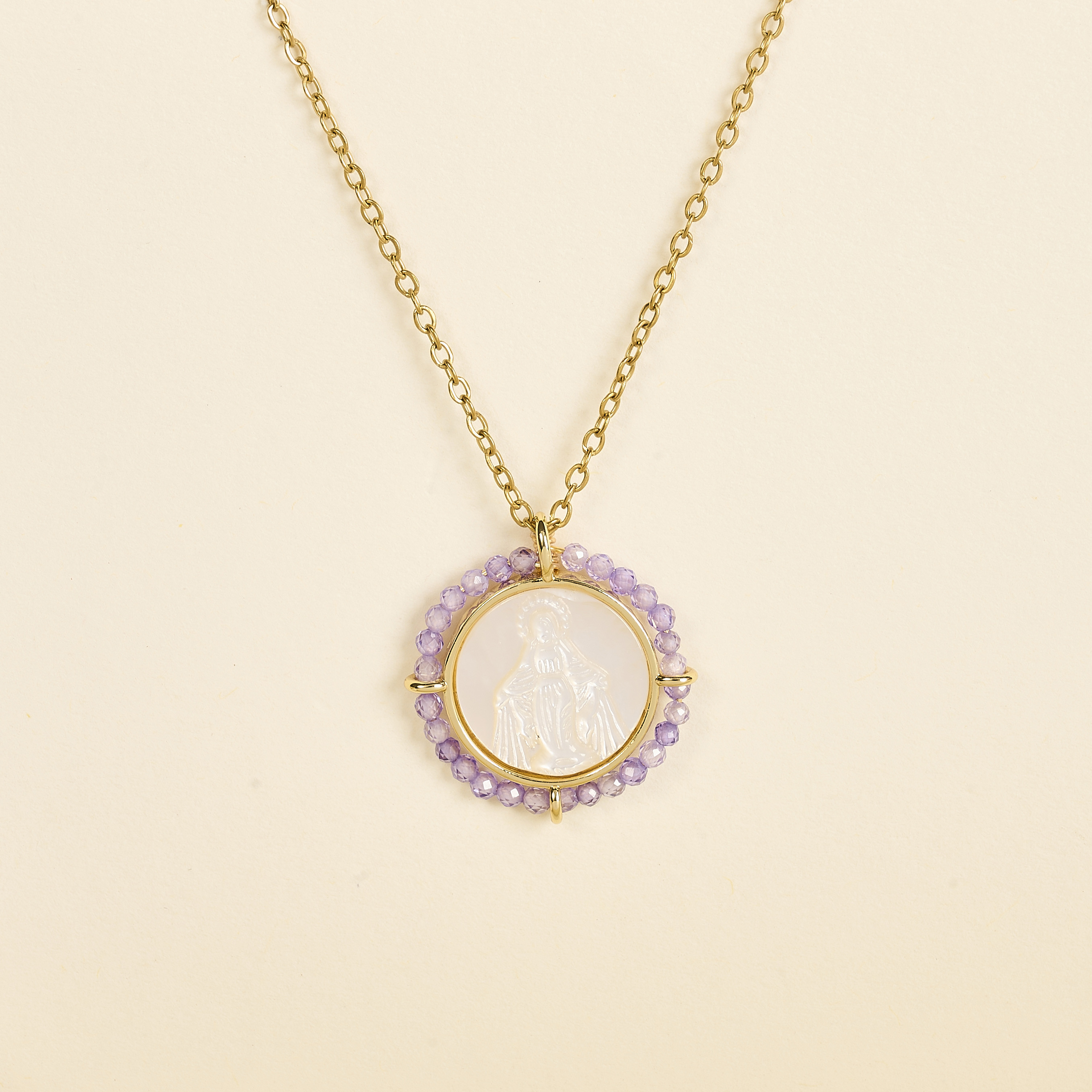 Le collier Lévi Violet allie mystère et lumière. Les perles violettes facettées entourent délicatement la Vierge en nacre, créant un contraste poétique et lumineux.