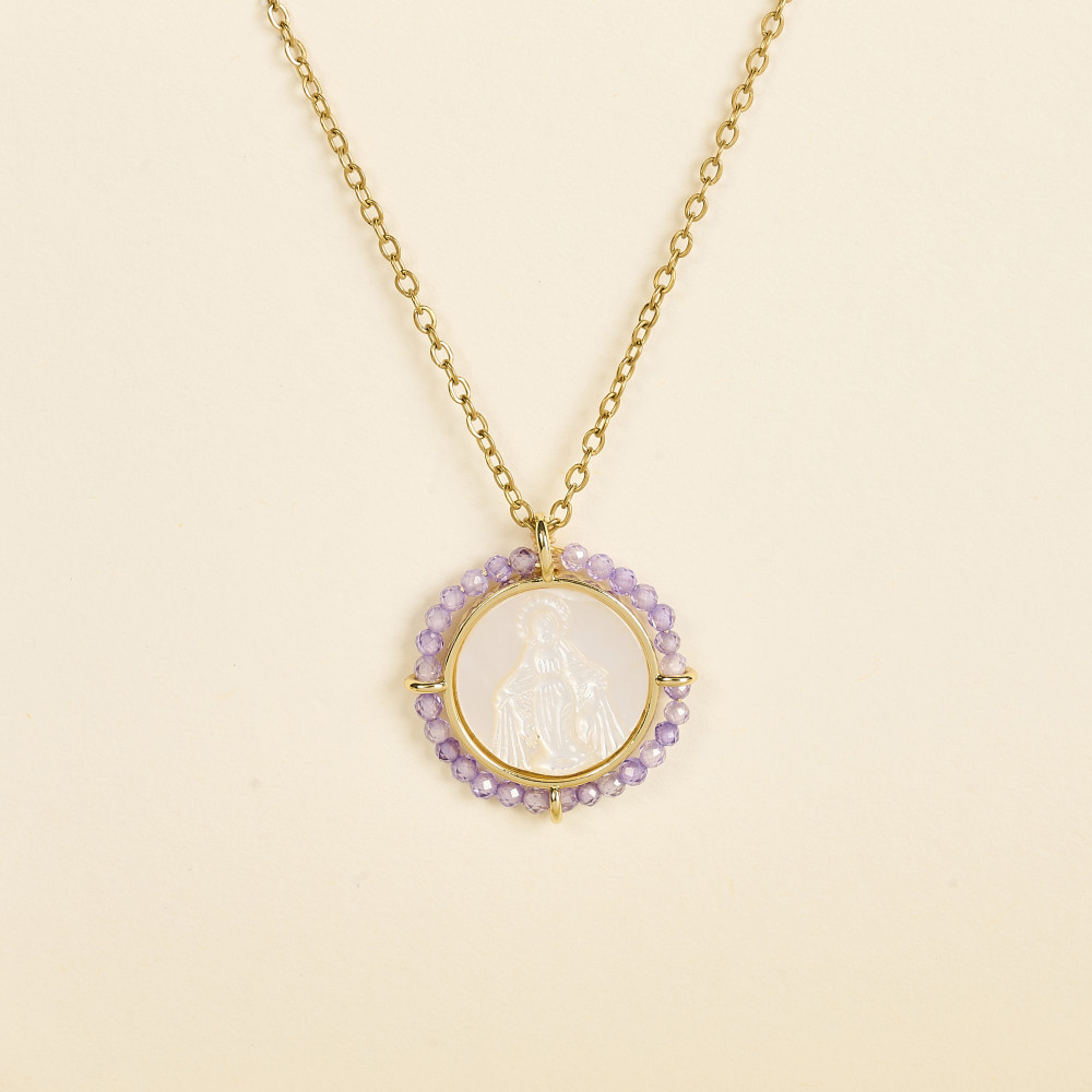 Le collier Lévi Violet allie mystère et lumière. Les perles violettes facettées entourent délicatement la Vierge en nacre, créant un contraste poétique et lumineux.