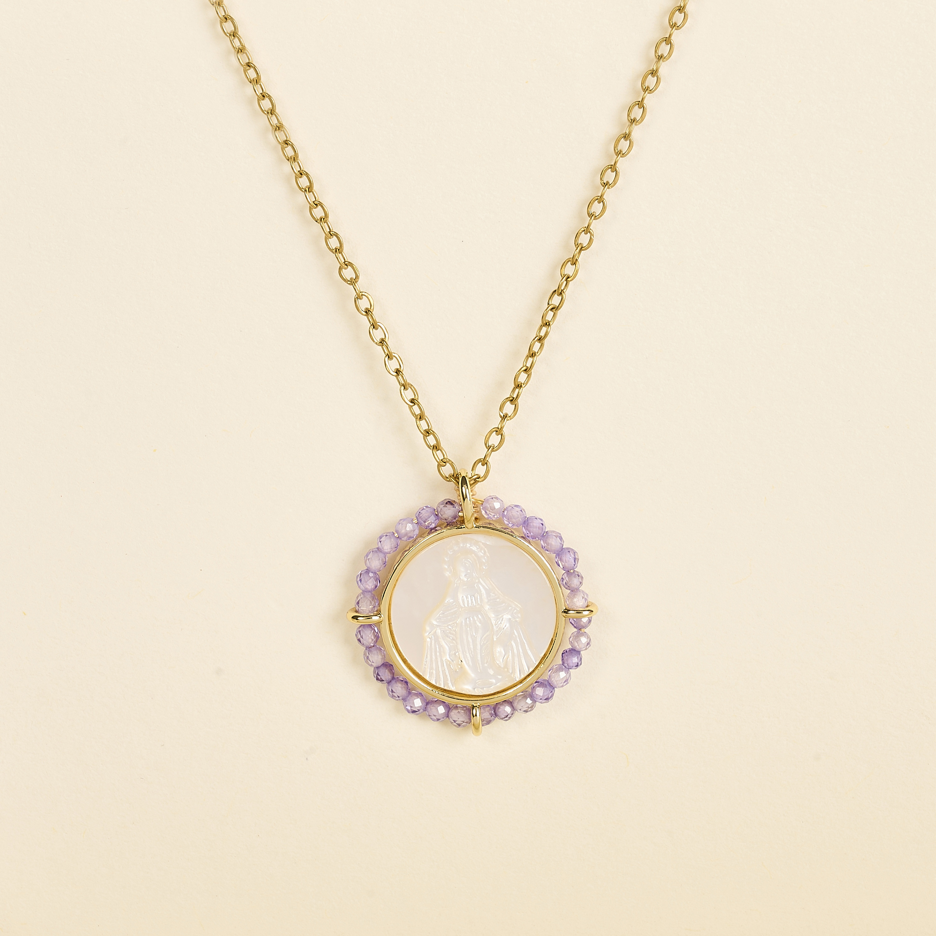Le collier Lévi Violet By Garance allie mystère et lumière. Les perles violettes facettées entourent délicatement la Vierge en nacre, créant un contraste poétique et lumineux.