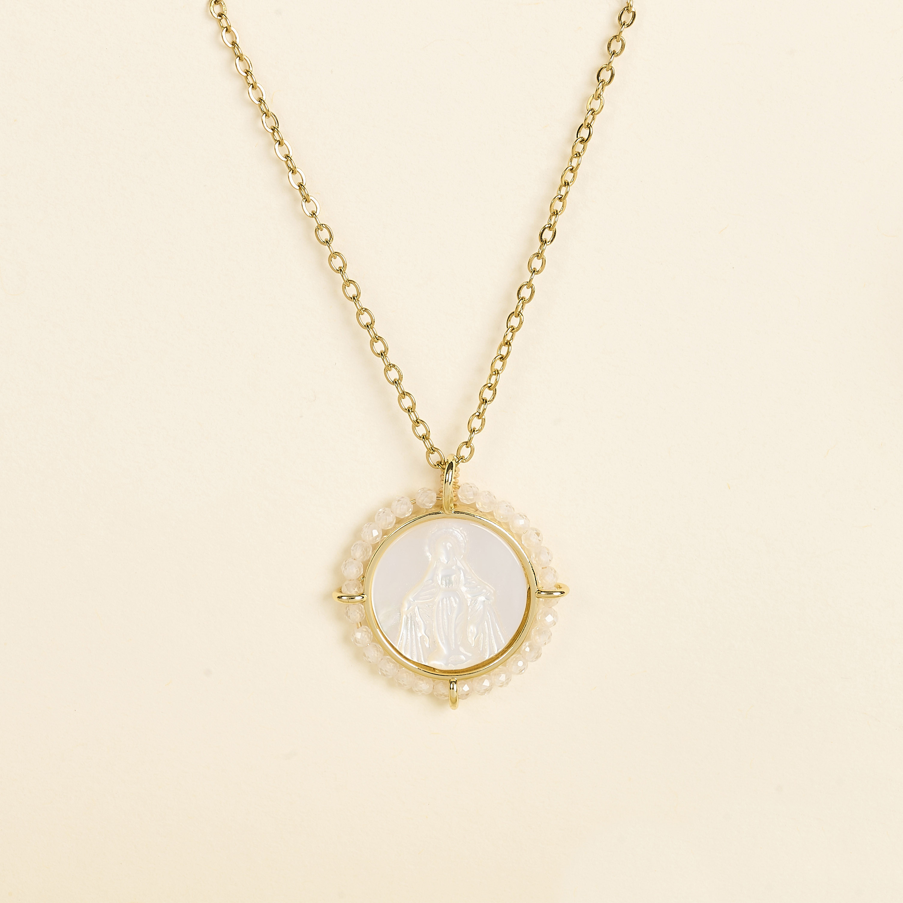 Le collier Lévi Blanc séduit par sa pureté et son éclat. Son médaillon en nacre ciselée, entouré de perles blanches, illumine le décolleté d’une lumière douce et intemporelle.