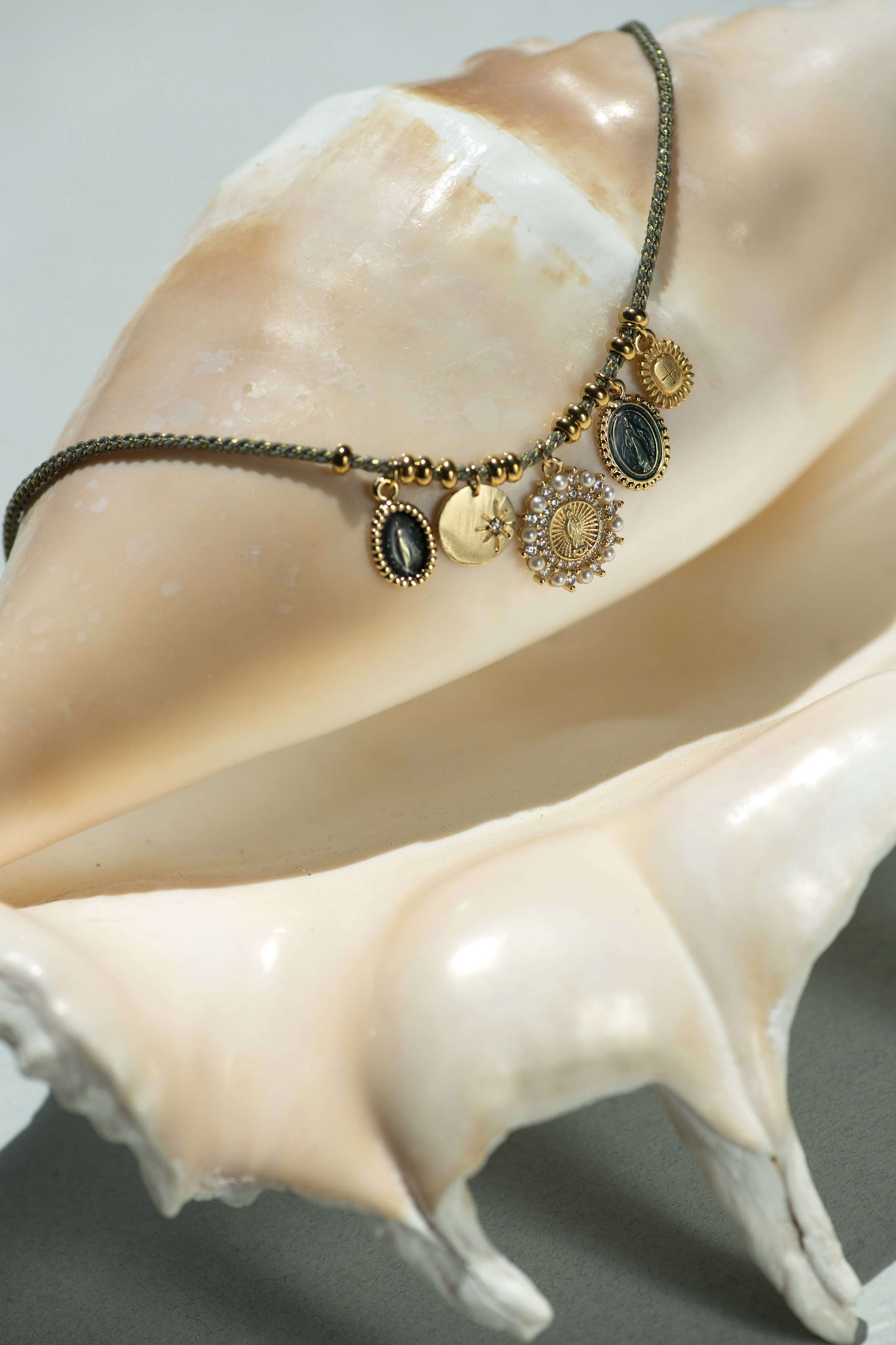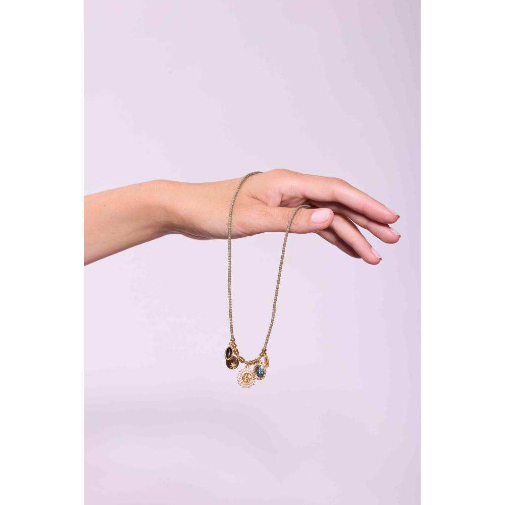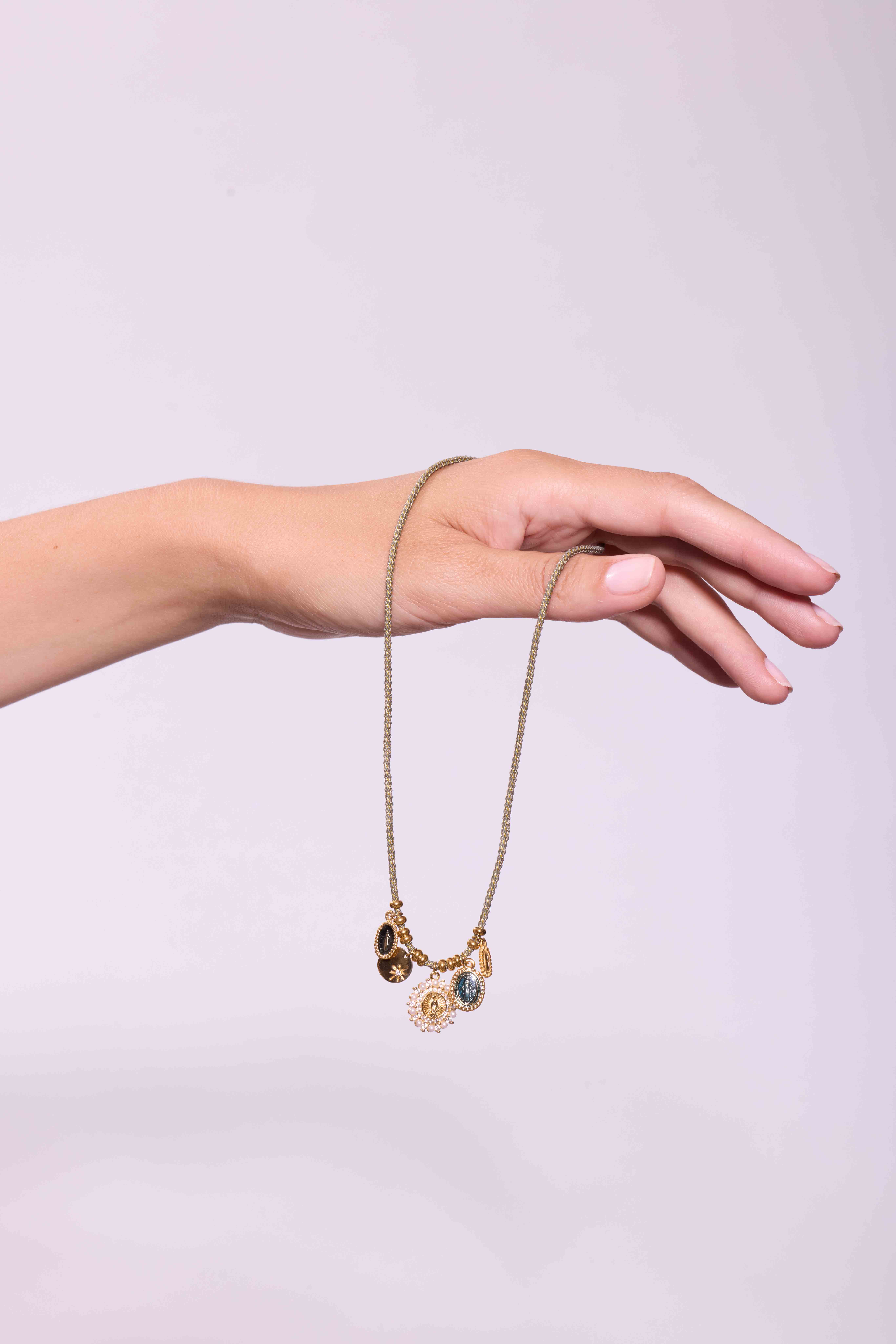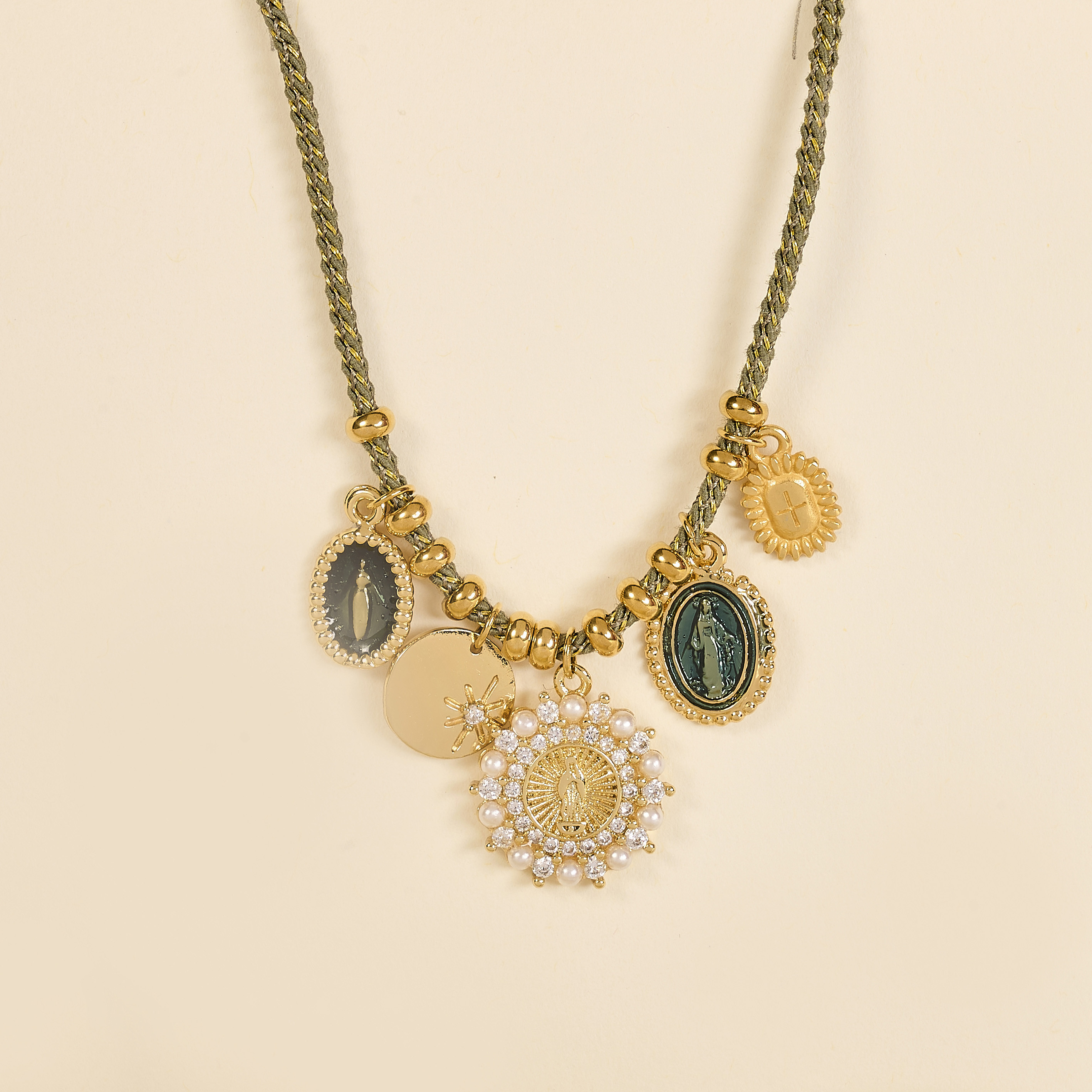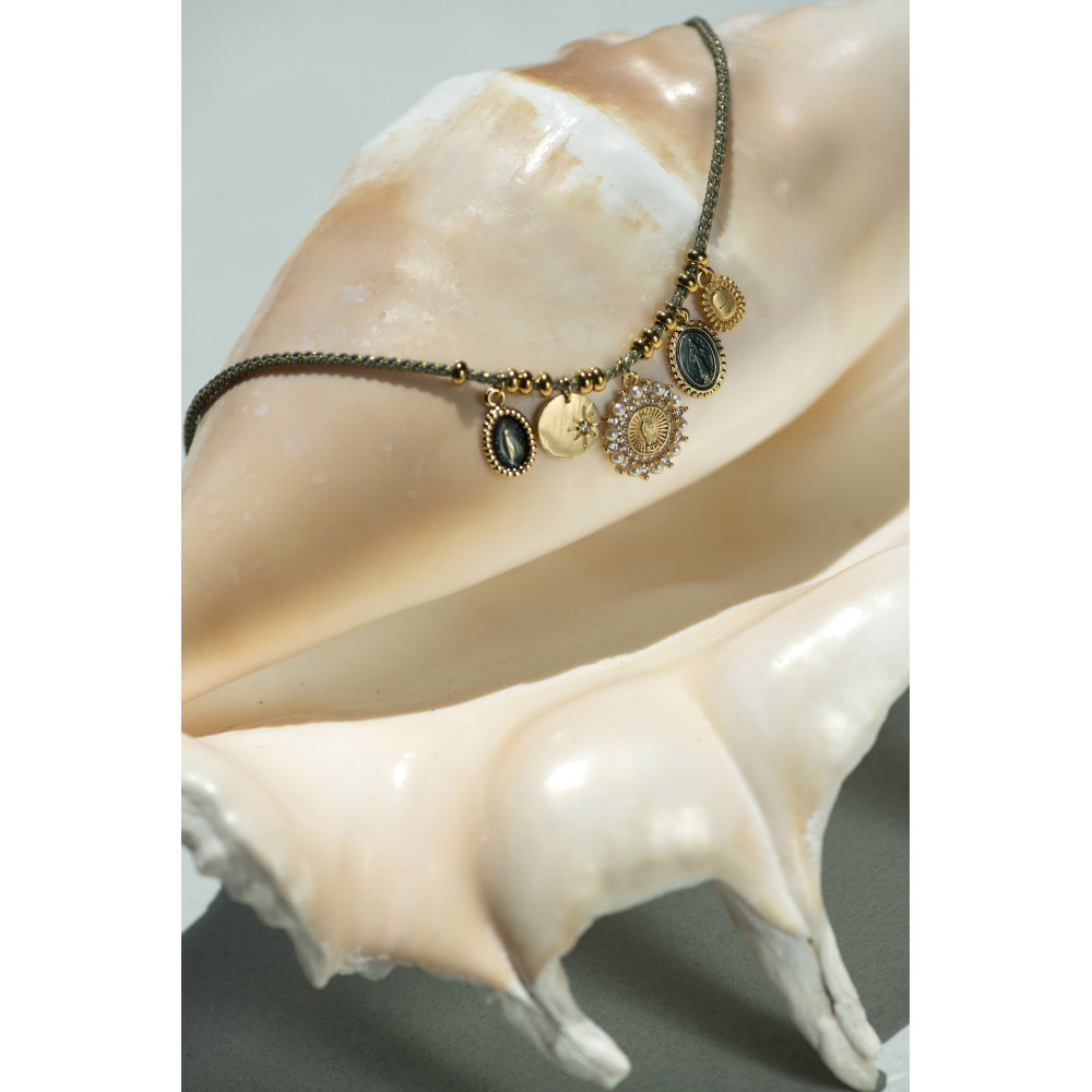 Le collier Lino Kaki mesure 38 cm. Il est réalisé sur un cordon tressé kaki et or et agrémenté de médailles dorées, dont une médaille de la Vierge et un médaillon perlé. Un bijou symbolique au ton élégant.