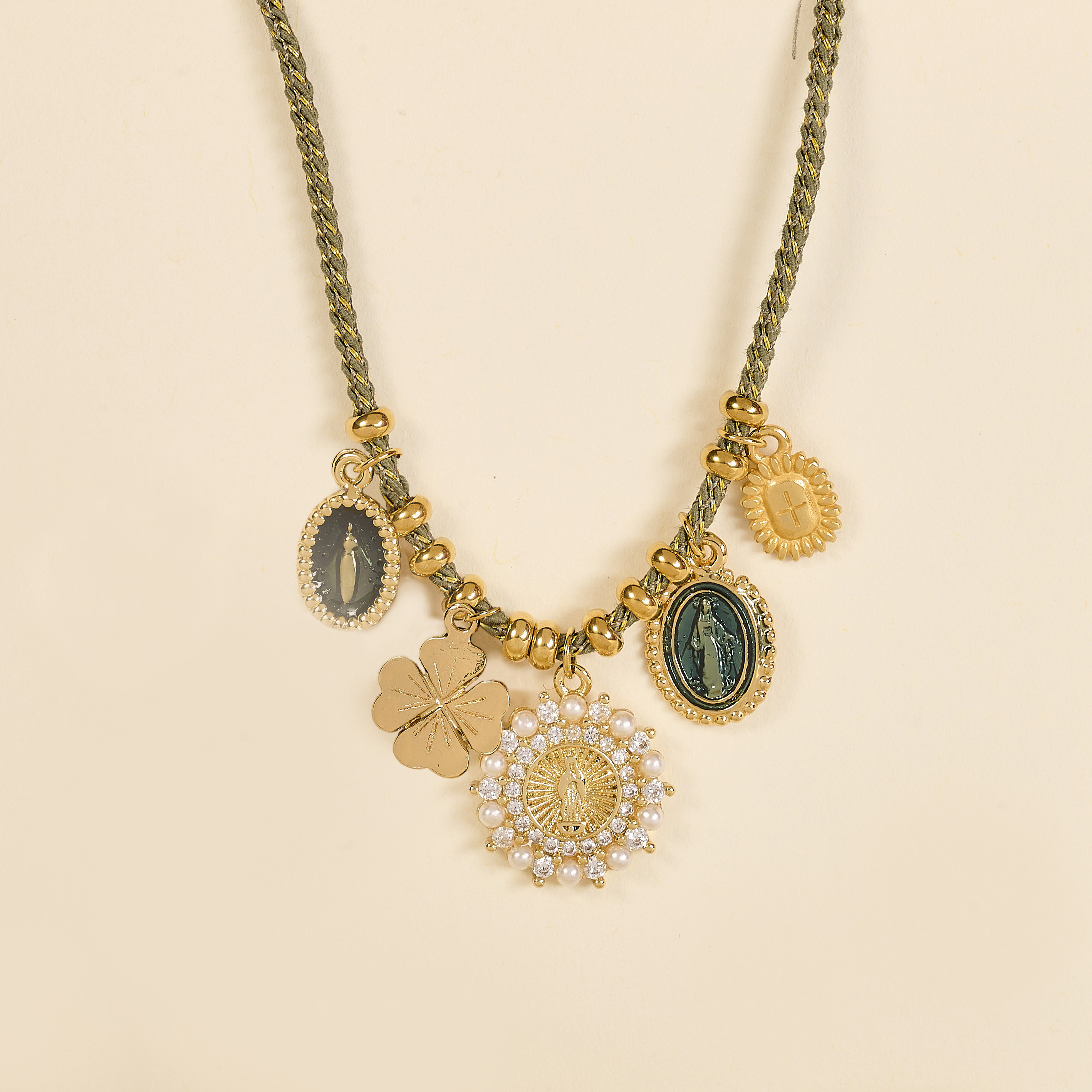 Le collier Lino Kaki By Garance mesure 38 cm. Il est réalisé sur un cordon tressé kaki et or et agrémenté de médailles dorées, dont une médaille de la Vierge et un médaillon perlé. Un bijou symbolique au ton élégant.