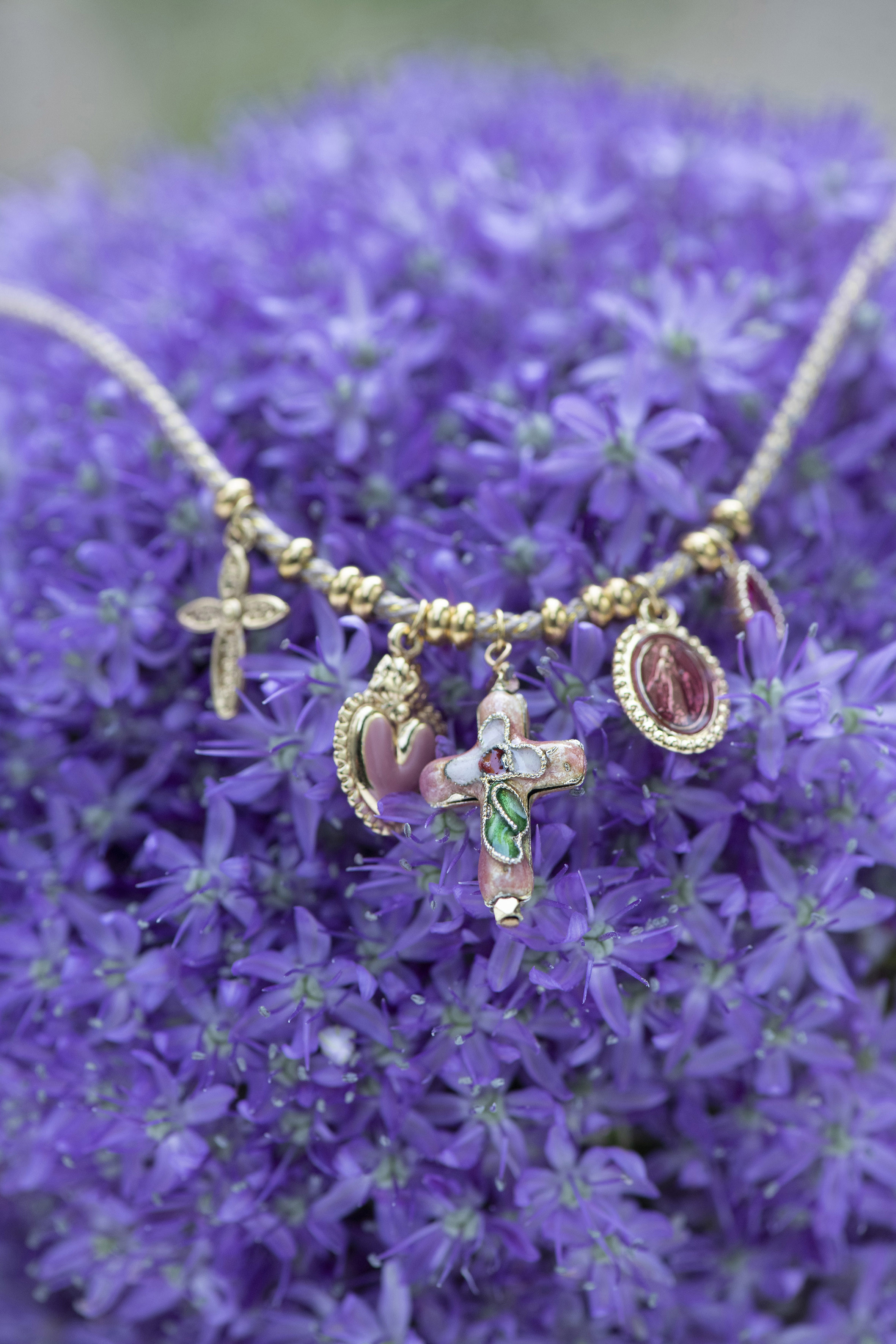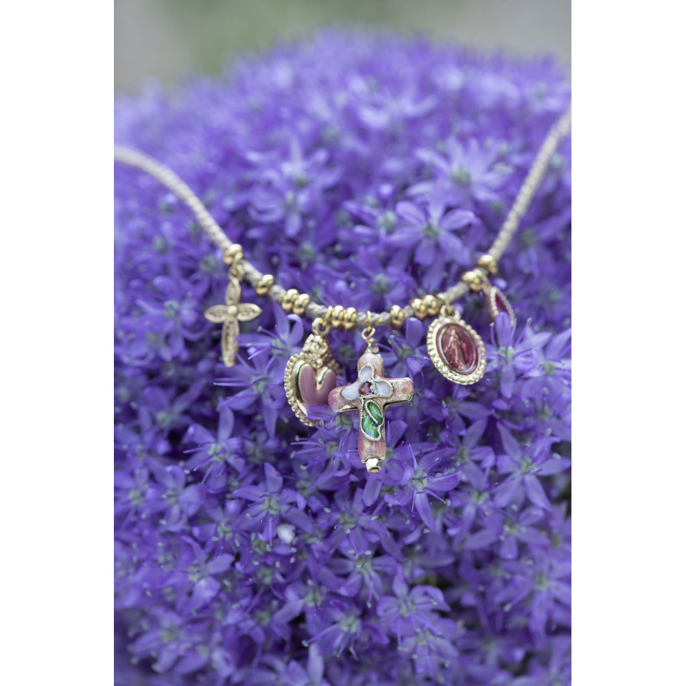 Le collier Lino Beige mesure 38 cm. Il se compose d’un cordon tressé beige et doré et de pendentifs dorés et émaillés : croix, cœur rose, médaille religieuse et goutte fuchsia. Un bijou féminin aux finitions soignées.