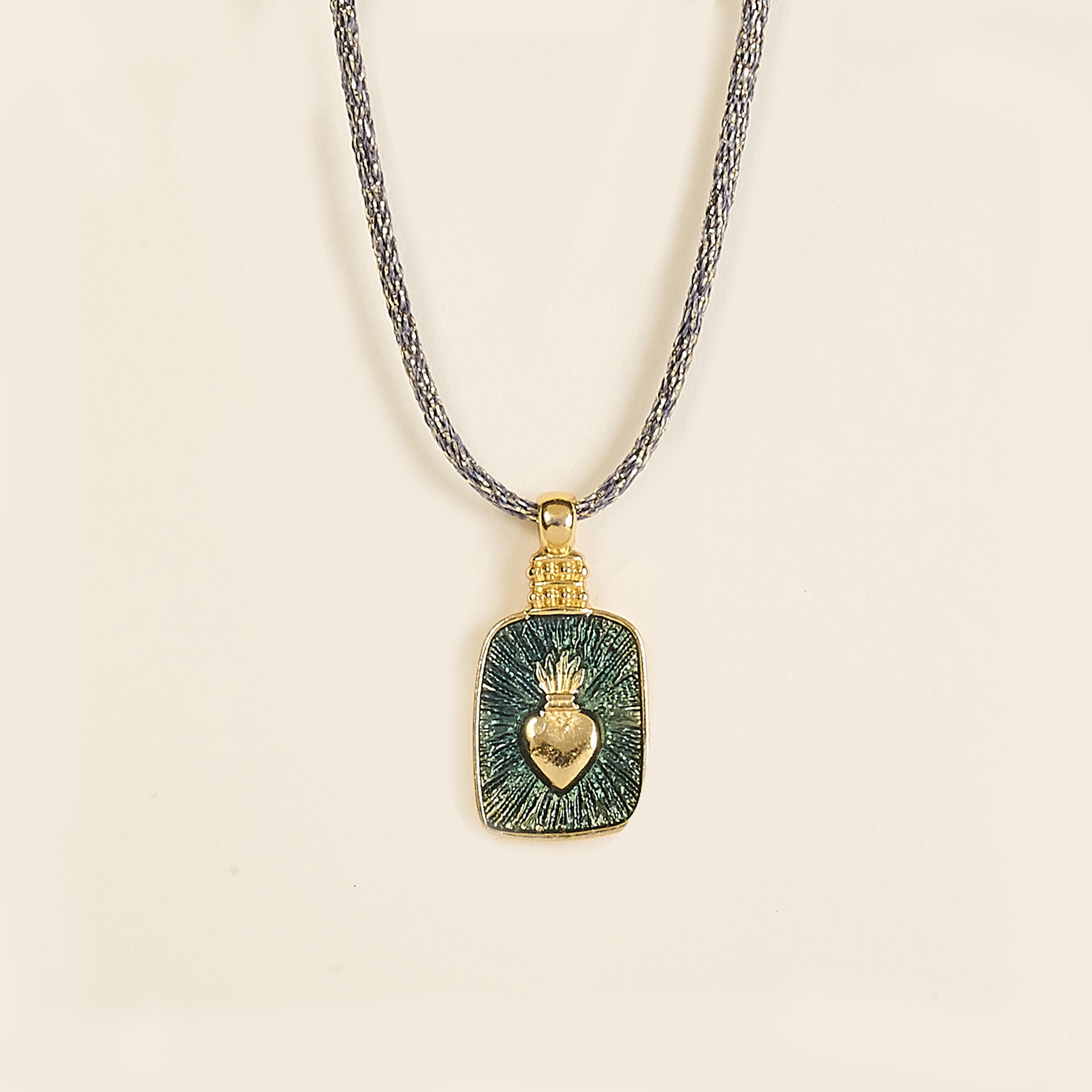 Le collier Liva Marine séduit par la profondeur de son bleu et la brillance du doré. L’émail scintillant du pendentif s’accorde à un cordon lurex marine pour un rendu élégant et intemporel.