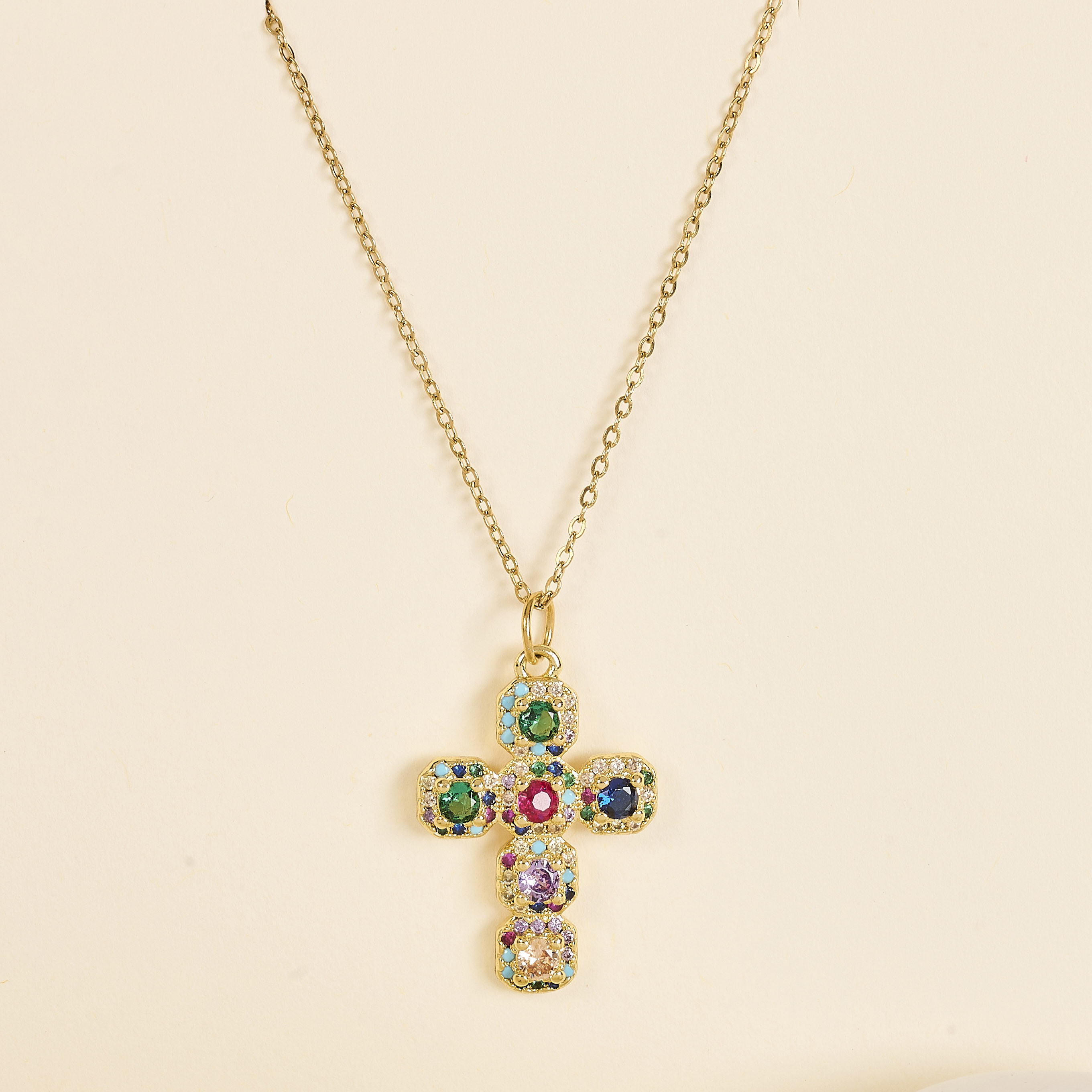 Le collier Lori Croix Multi se distingue par son pendentif croix pavé de pierres colorées sur une base dorée. Un bijou fort et lumineux, à porter seul ou en accumulation.