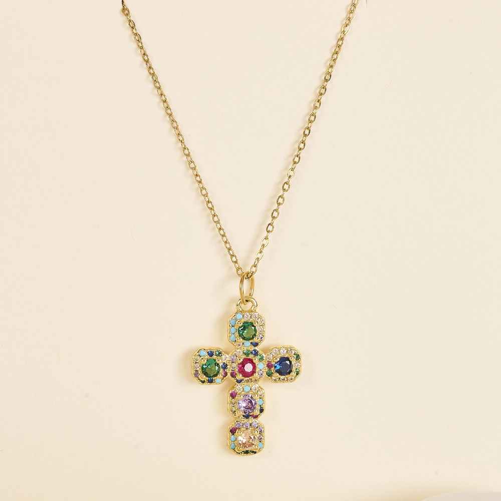 Le collier Lori Croix Multi se distingue par son pendentif croix pavé de pierres colorées sur une base dorée. Un bijou fort et lumineux, à porter seul ou en accumulation.