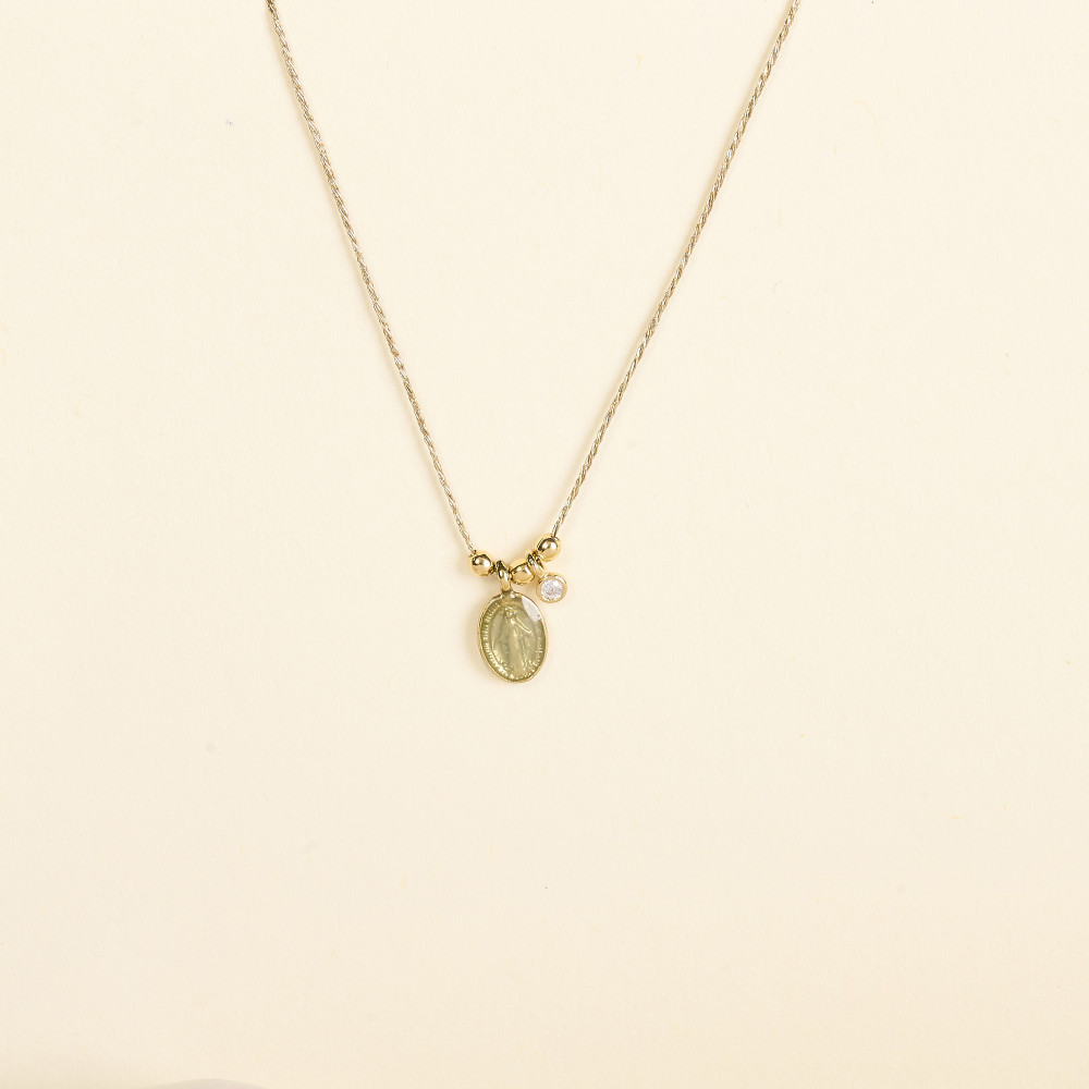 Le collier Lyra Céladon By Garance met en valeur un médaillon délicatement émaillé dans une teinte céladon douce et apaisante. Les perles dorées et la pampille claire ajoutent un joli jeu de lumière. La chaîne réglable de 36 à 45 cm assure un porté élégant et confortable.