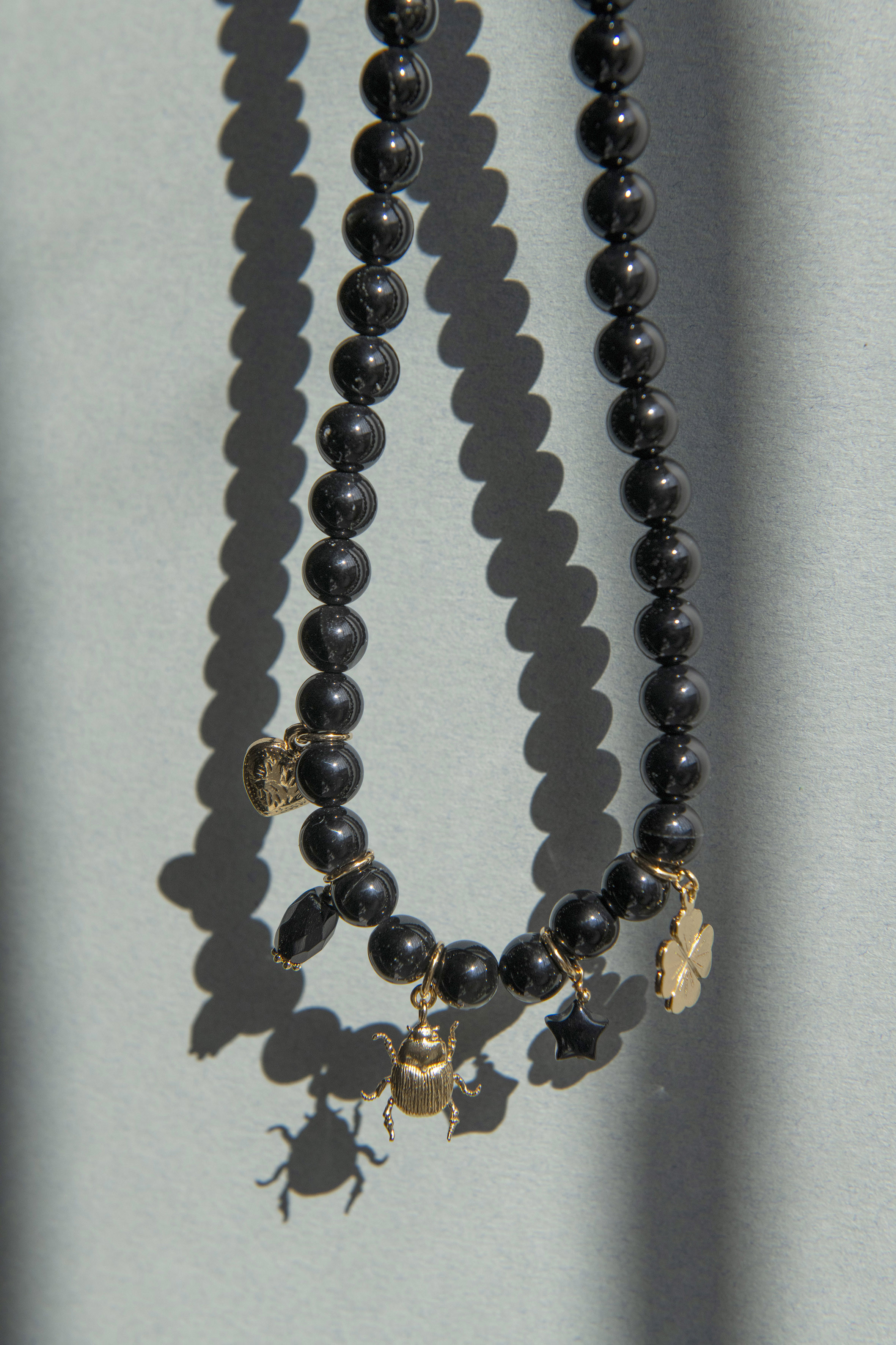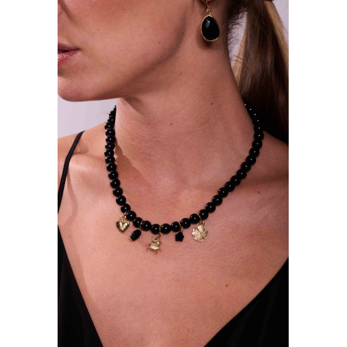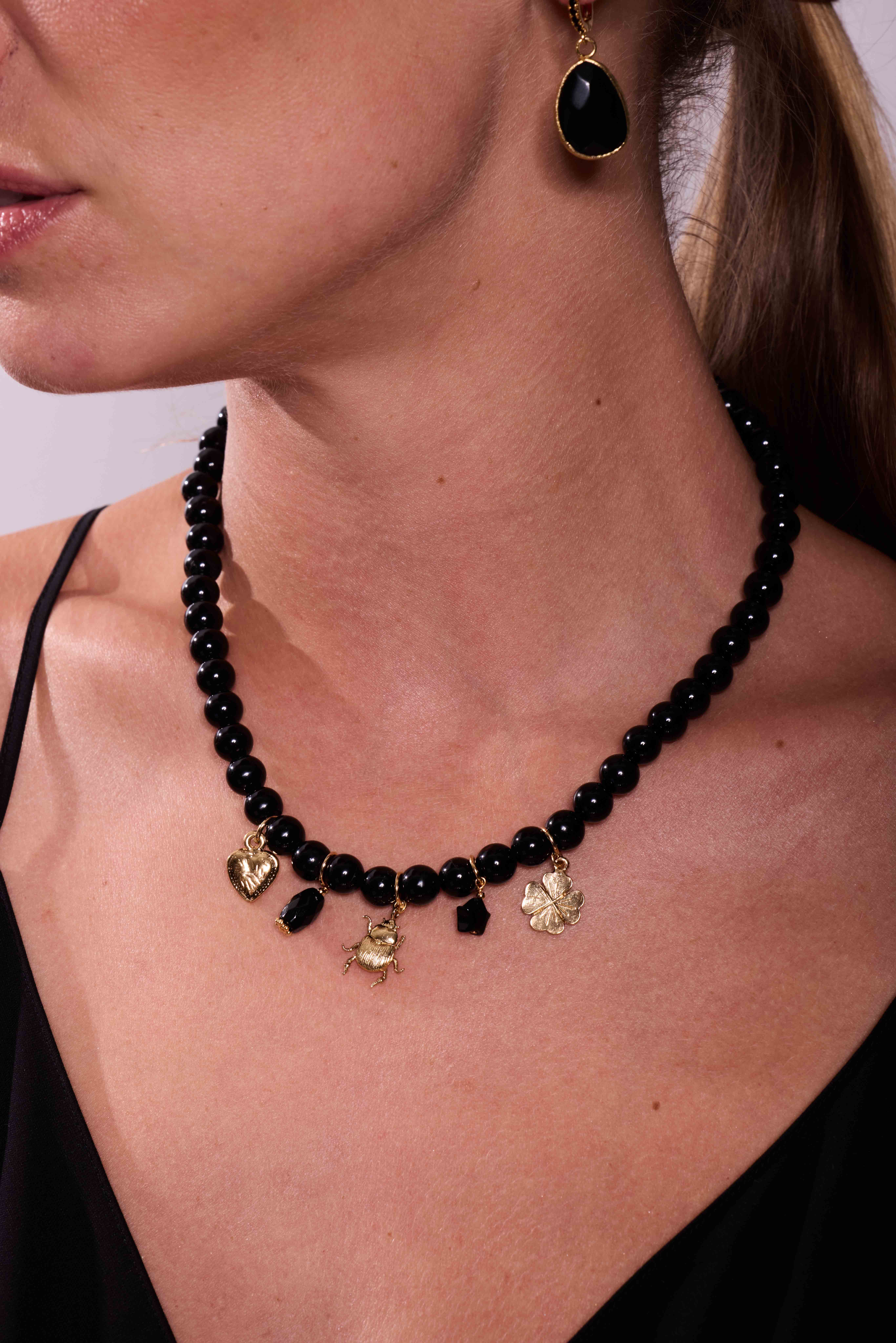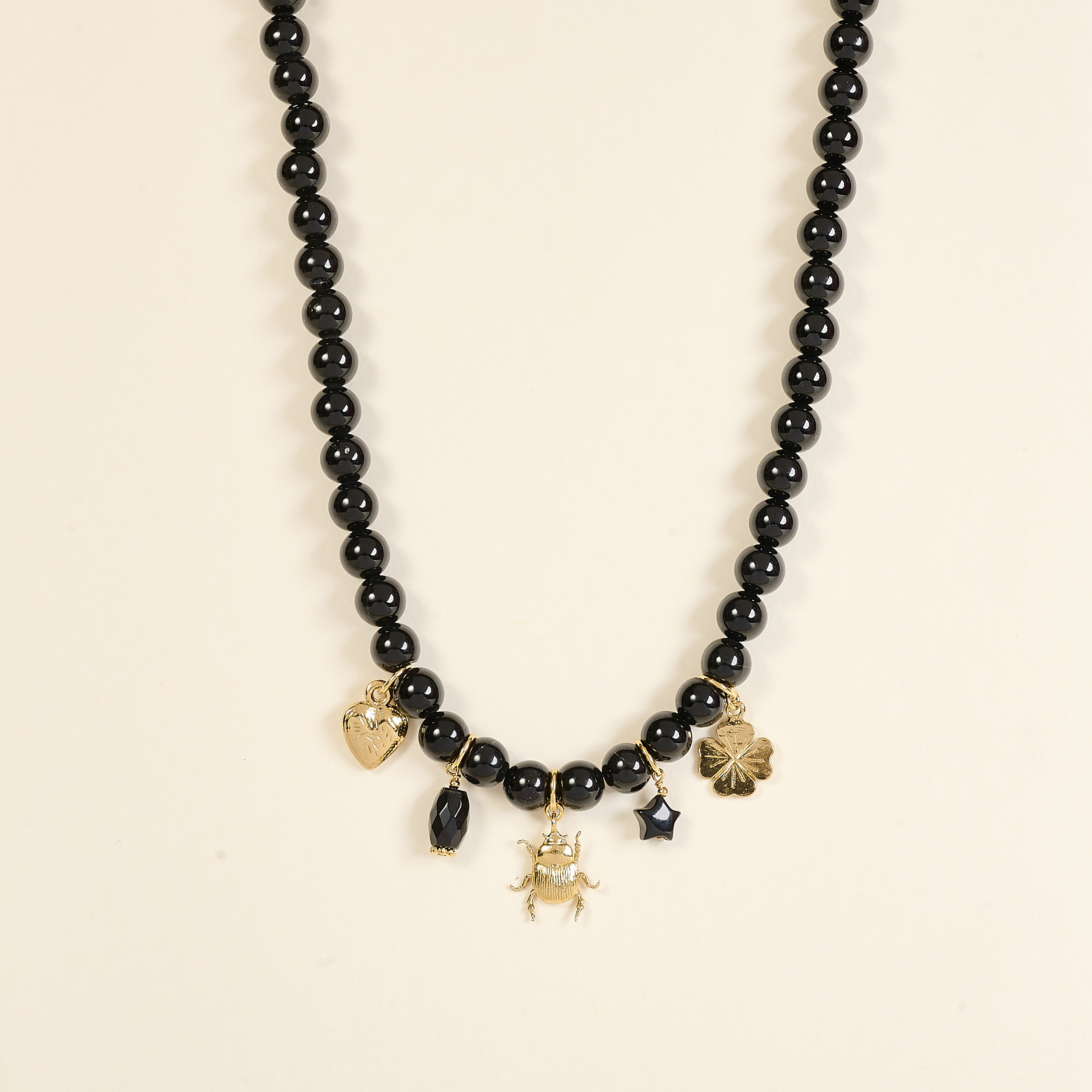 Ce collier de 38 cm de longueur est composé de perles rondes en agate noire de 8 mm, sublimées par des pendentifs dorés symboliques : un scarabée porte-bonheur, un cœur gravé, une étoile et un trèfle à quatre feuilles.
