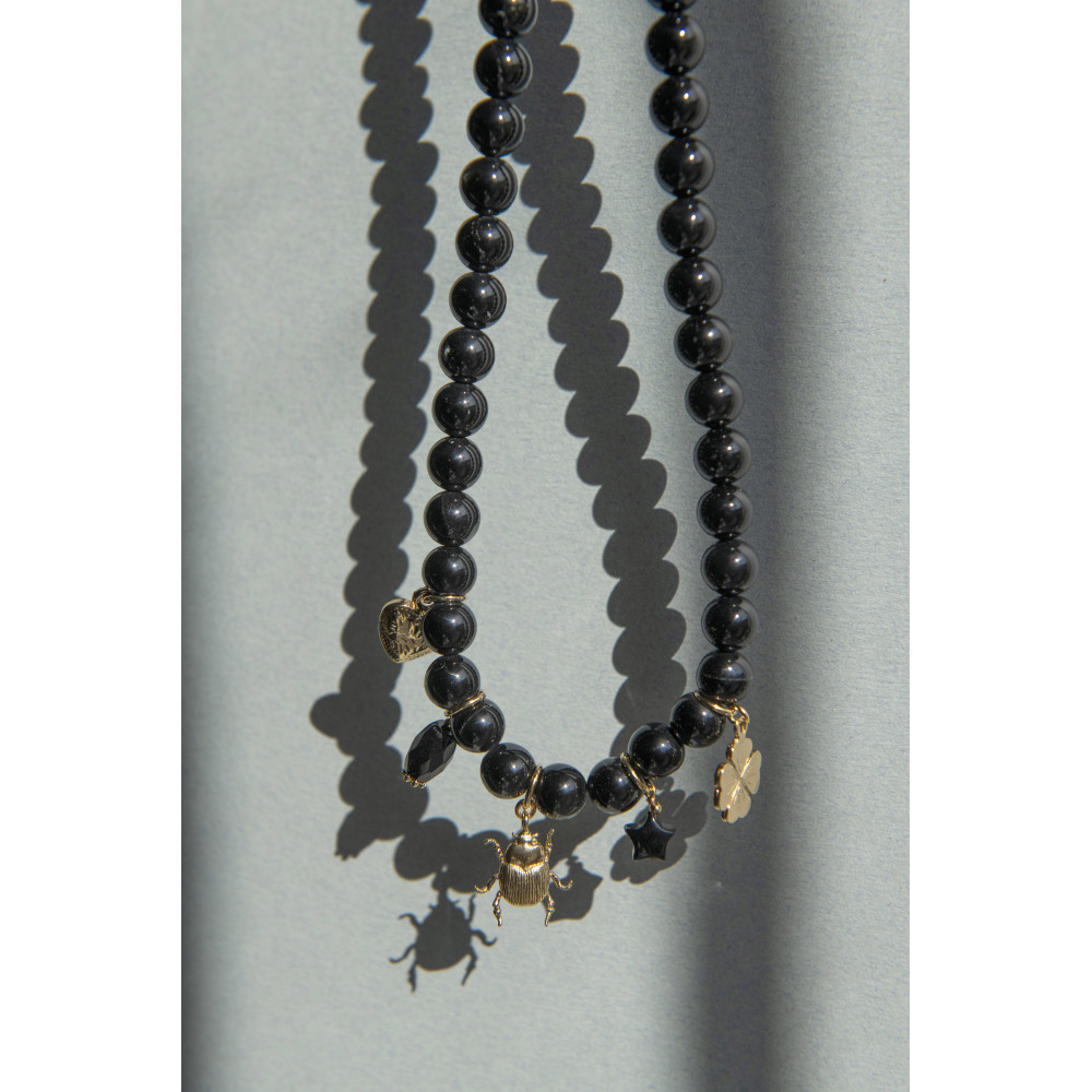 Ce collier de 38 cm de longueur est composé de perles rondes en agate noire de 8 mm, sublimées par des pendentifs dorés symboliques : un scarabée porte-bonheur, un cœur gravé, une étoile et un trèfle à quatre feuilles.