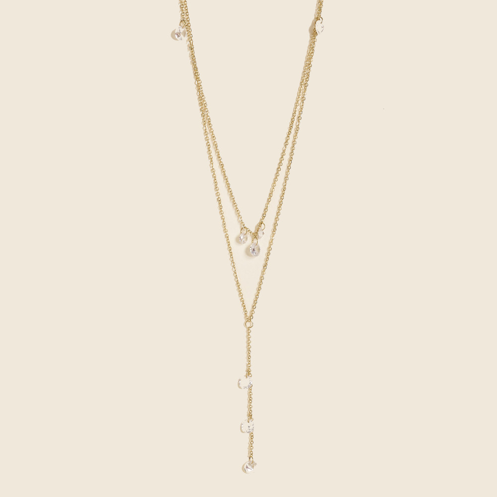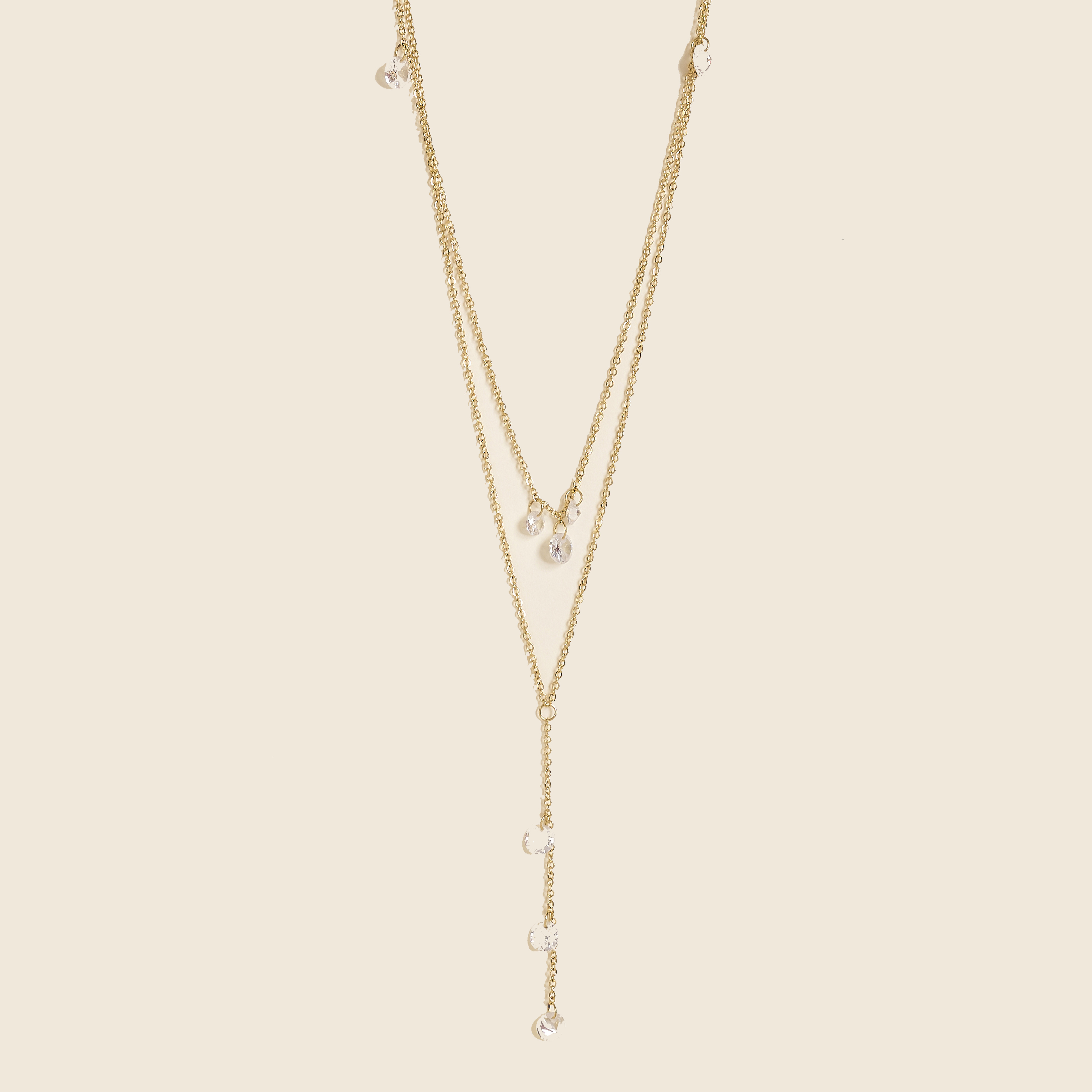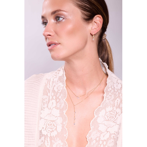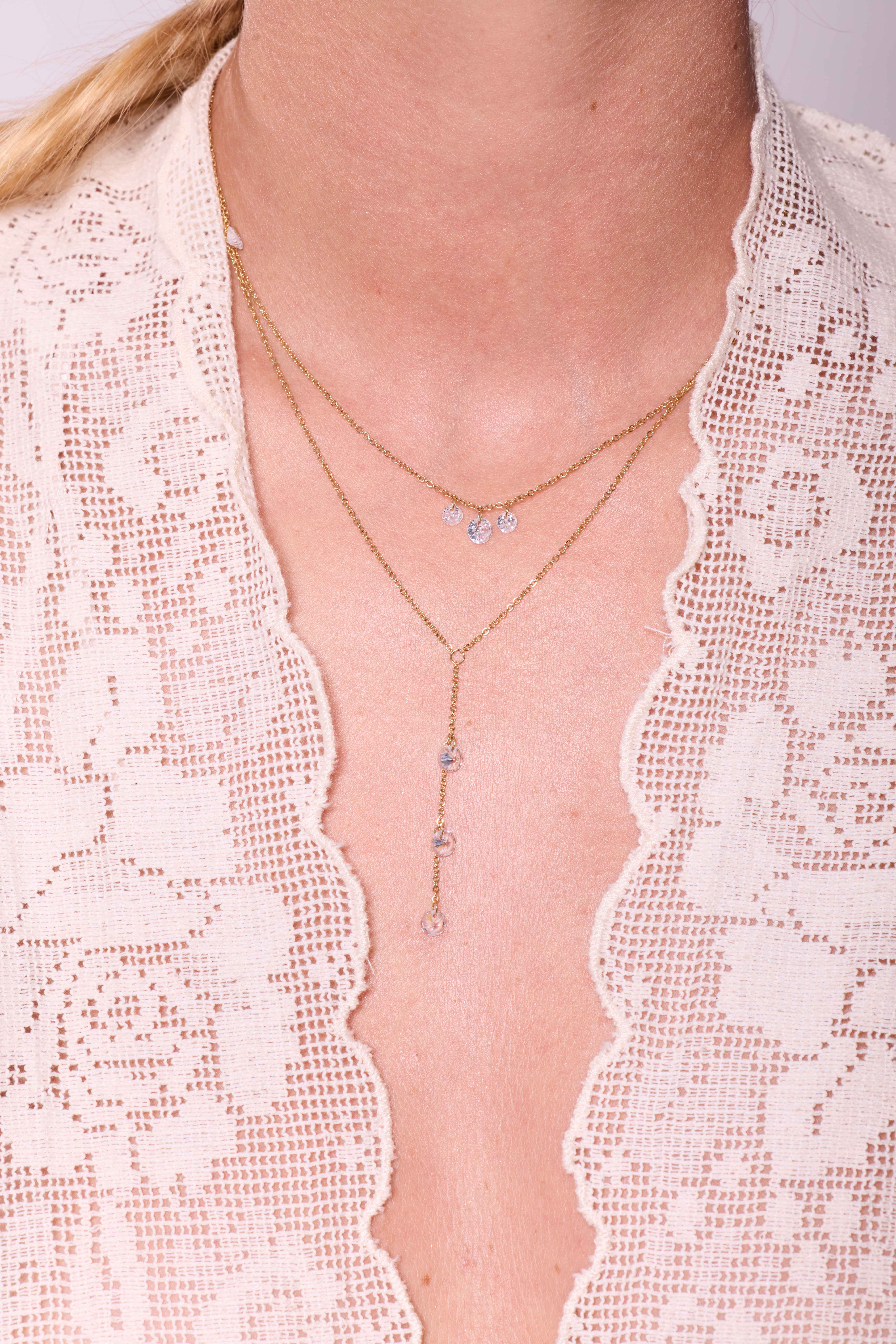 Le collier double tour se compose de deux chaînes très fines de 1 mm de diamètre. Le premier tour est orné de pendentifs en cristal de roche, tandis que le second forme un élégant collier en Y, apportant originalité et modernité à l’ensemble. Facile à porter et raffiné, il se distingue par son style délicat et harmonieux. La première chaîne mesure 38 cm et la seconde 45 cm, offrant un porté parfait et superposé.