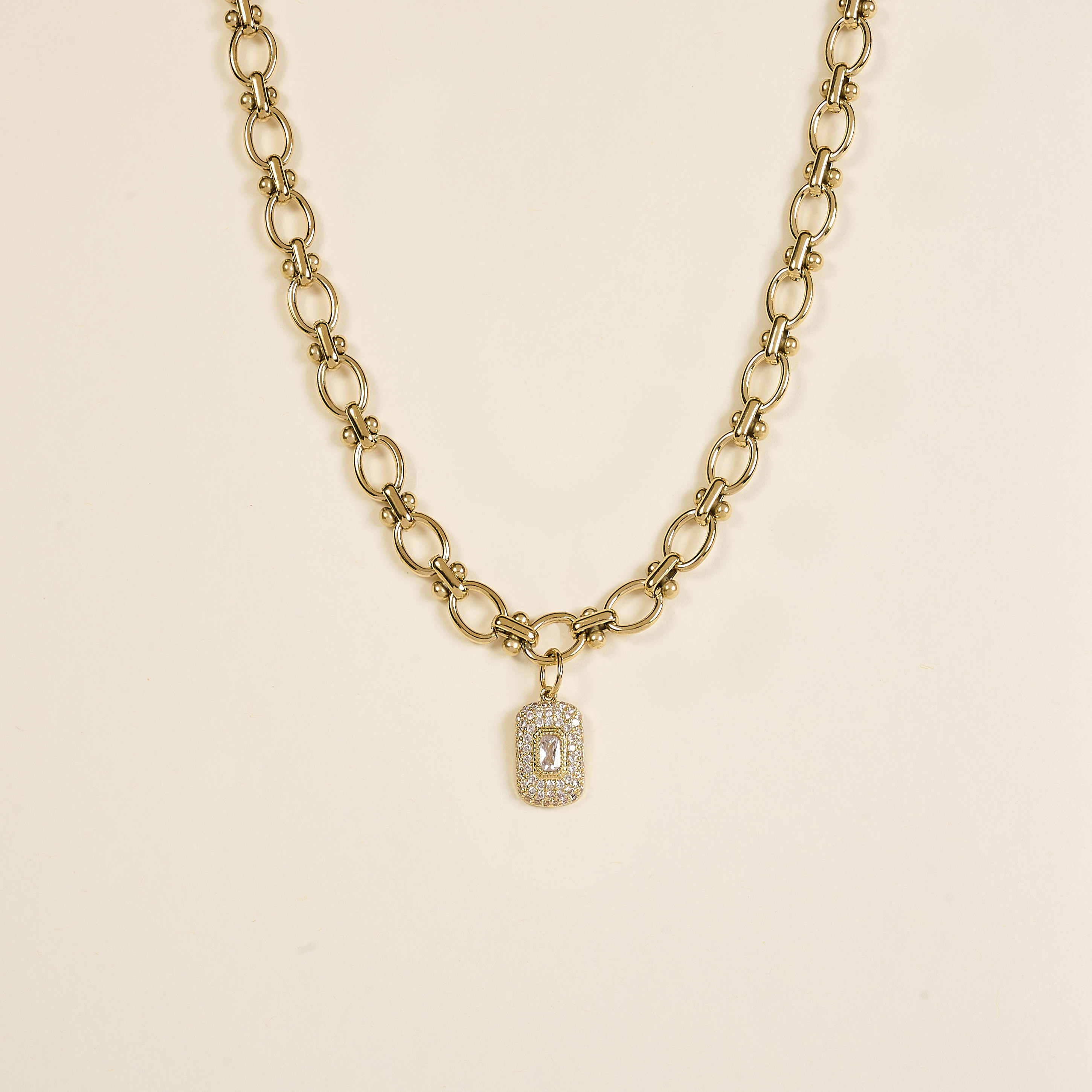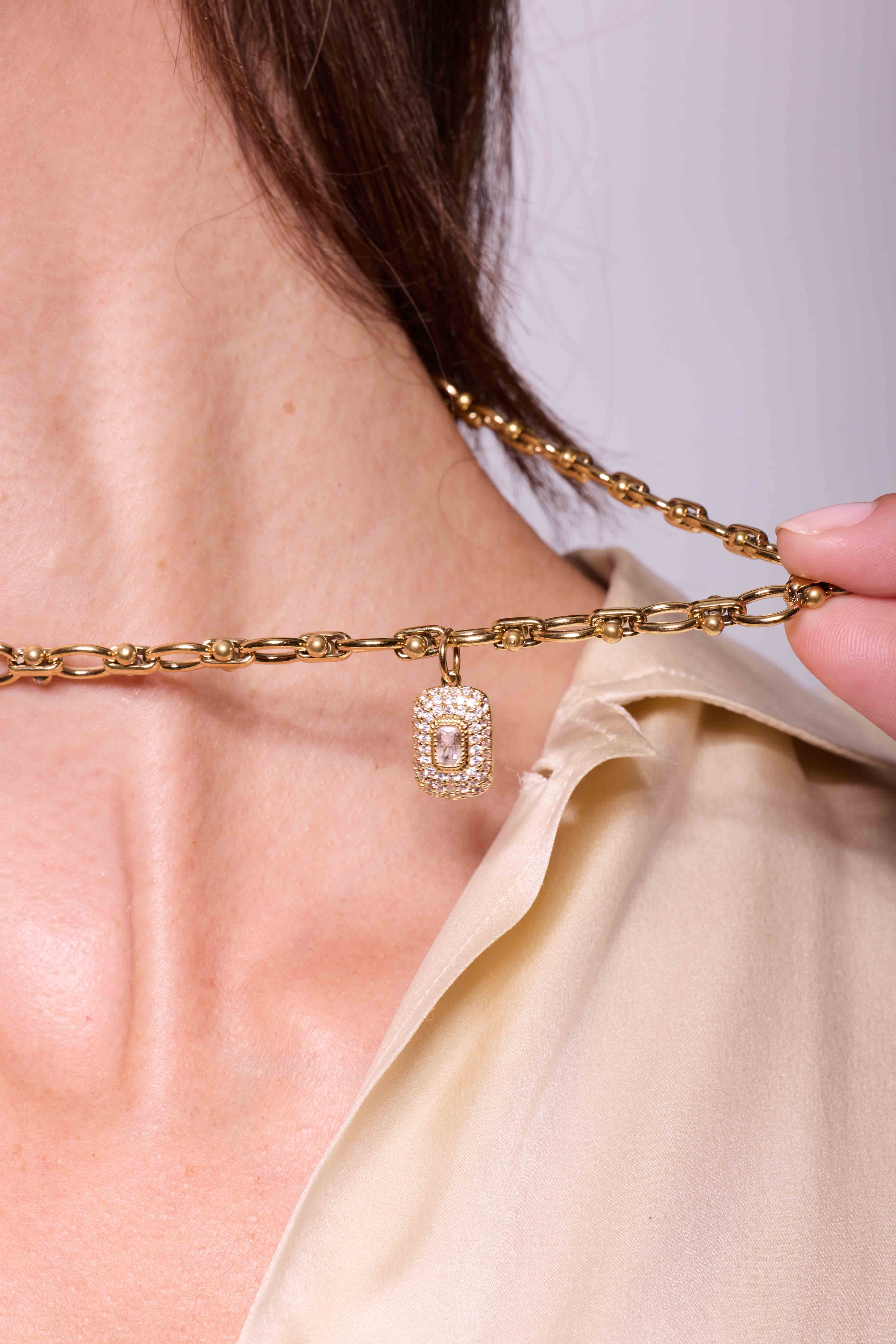 Le collier Sven se compose d’une chaîne épaisse en acier, sublimée par un pendentif serti d’oxydes de zirconium en forme de rectangle arrondi.