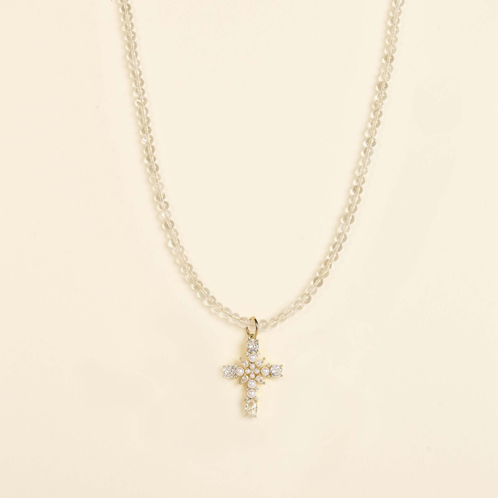 Le collier Sven est composé de perles rondes en cristal de roche de 3 mm, sublimées par un pendentif en forme de croix, serti d’oxydes de zirconium et de perles de culture. D’une longueur de 42 cm, il se porte seul ou en accumulation pour un look chic et moderne. Son design allie élégance et originalité, apportant une touche raffinée à toutes vos tenues.