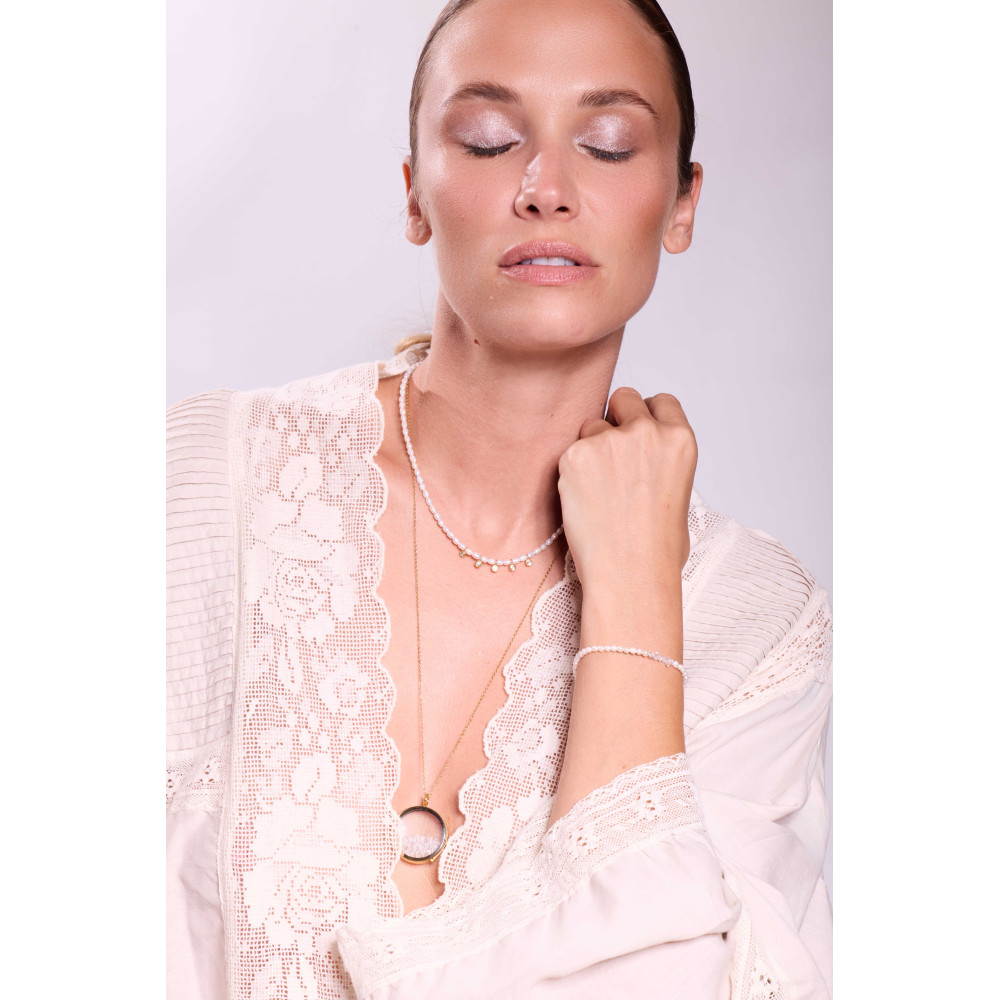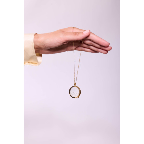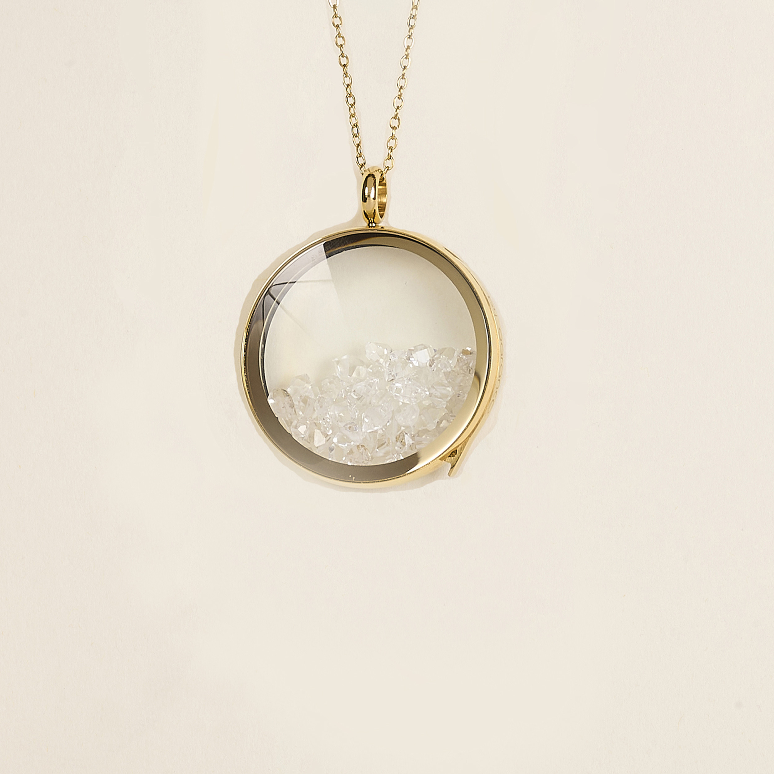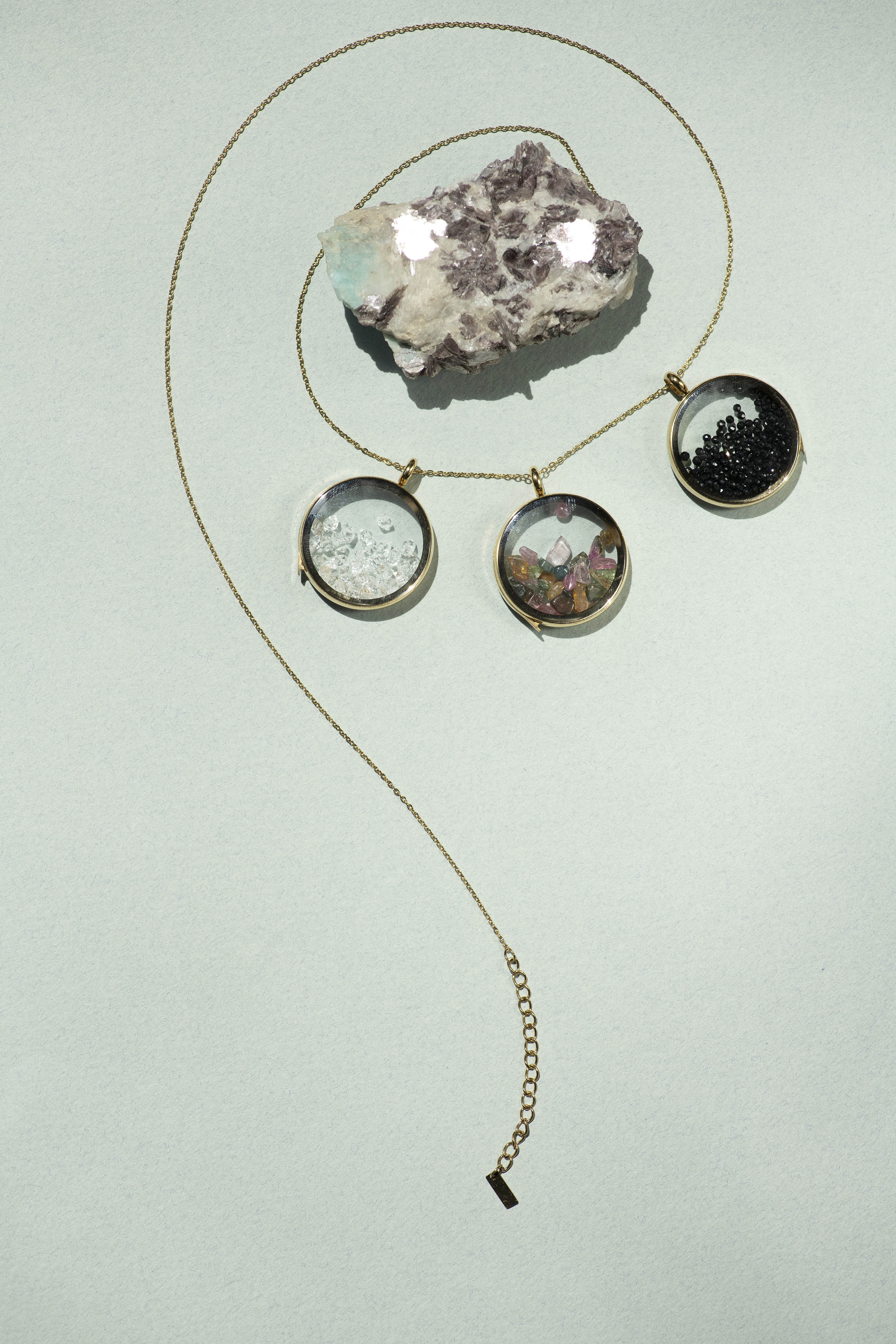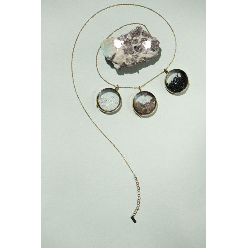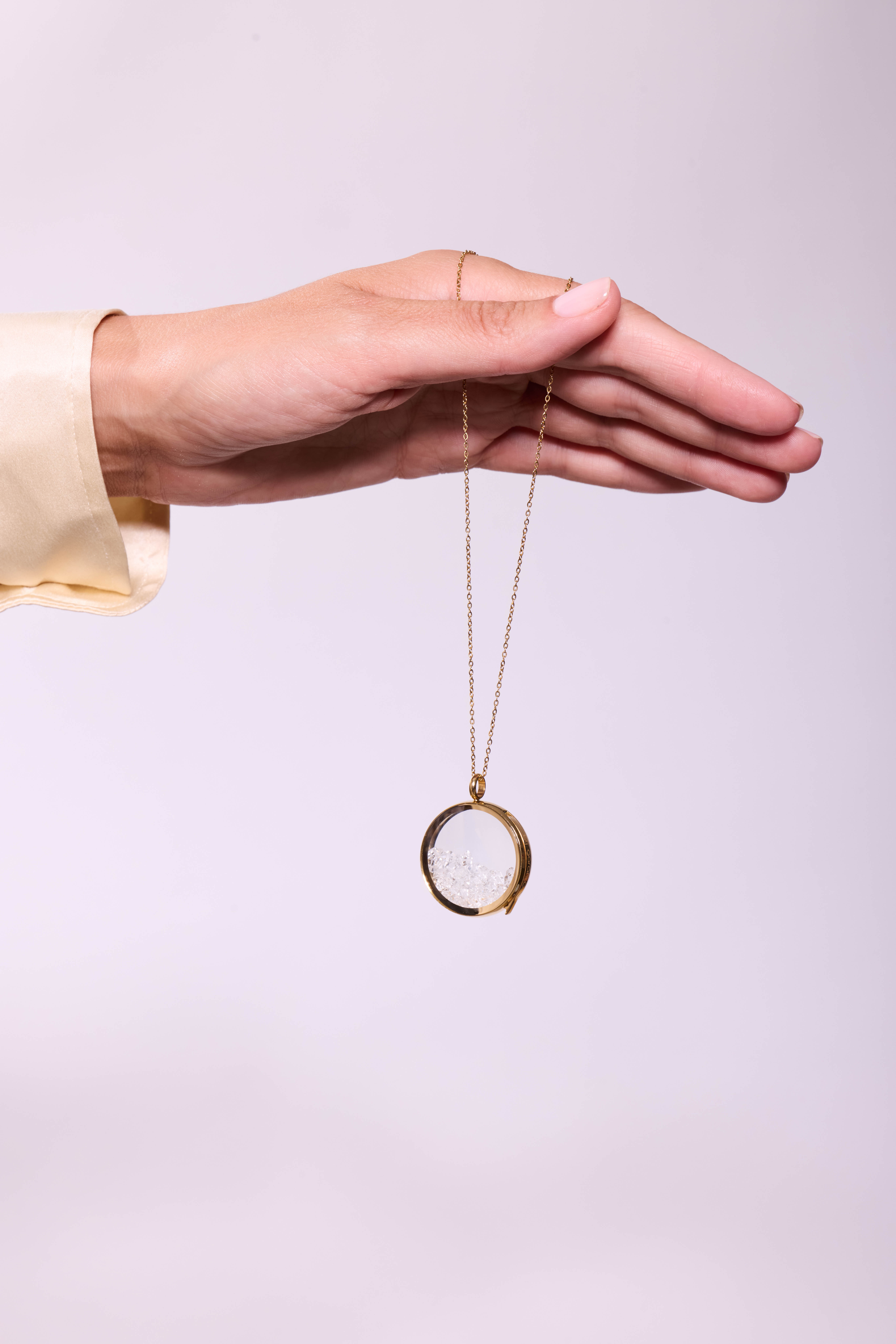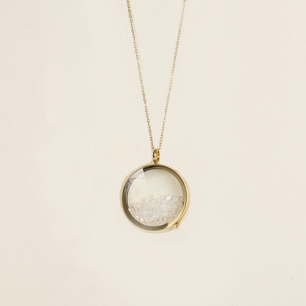 Le collier Tara se distingue par son pendentif rond à verre bombé, tel une loupe, qui s’ouvre et contient déjà des diamants Herkimer et des cristaux. Il peut également accueillir vos petits trésors personnels, comme du sable ou de petites médailles. Monté sur une chaîne très fine en acier de 60 cm, il allie délicatesse et originalité. Le collier Tara est un incontournable de la marque, parfait pour porter vos souvenirs les plus précieux près du cœur.