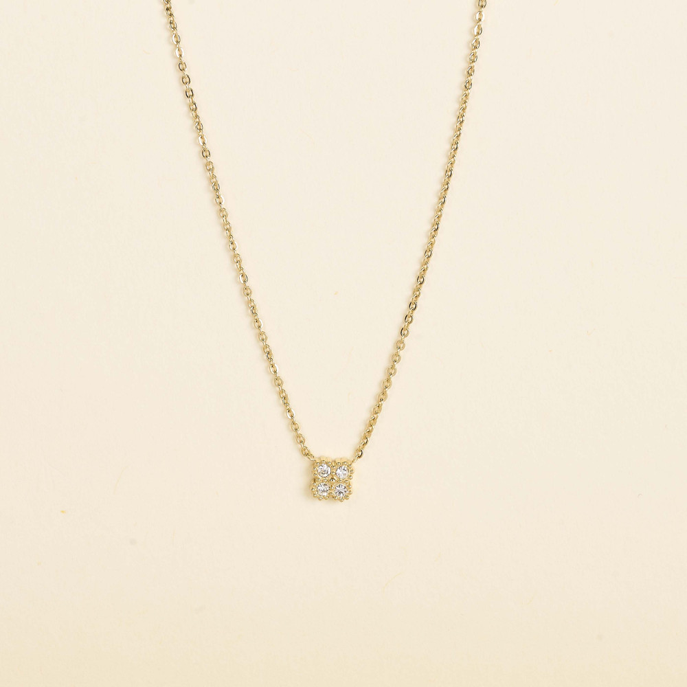 Médaille lumineuse pavée d’oxydes de zirconium en forme de carré, suspendue à une fine chaîne d’acier de 1 mm qui effleure la peau avec légèreté.