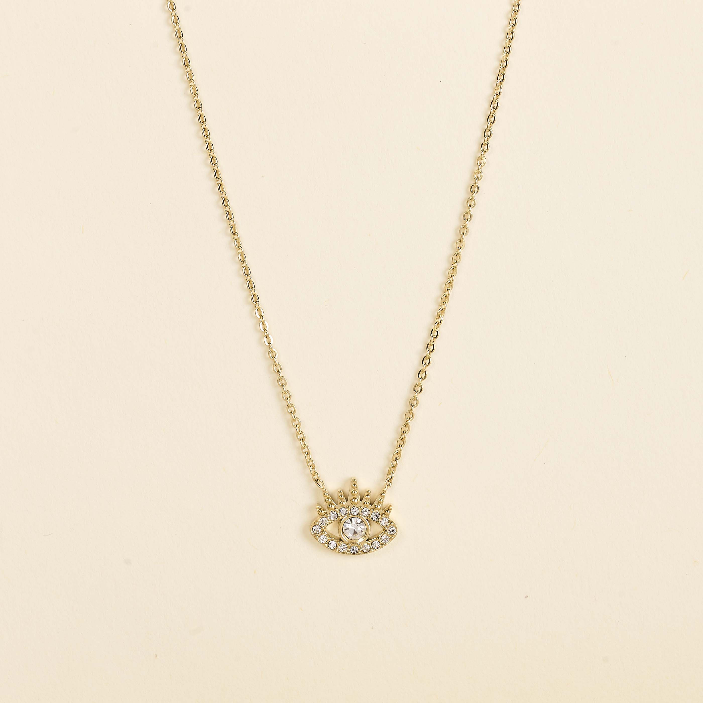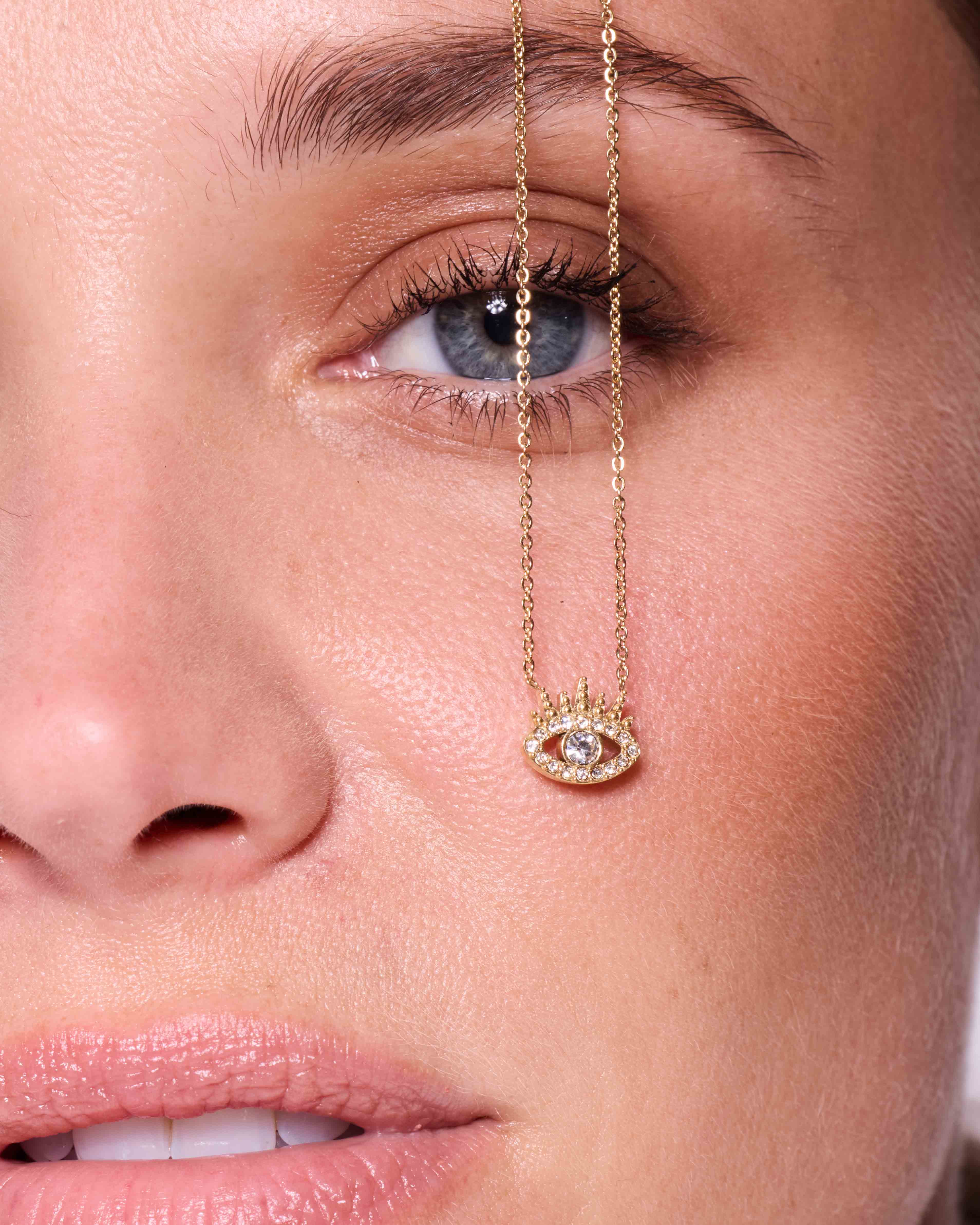 Médaille lumineuse pavée d’oxydes de zirconium en forme d'oeil, suspendue à une fine chaîne d’acier de 1 mm qui effleure la peau avec légèreté.