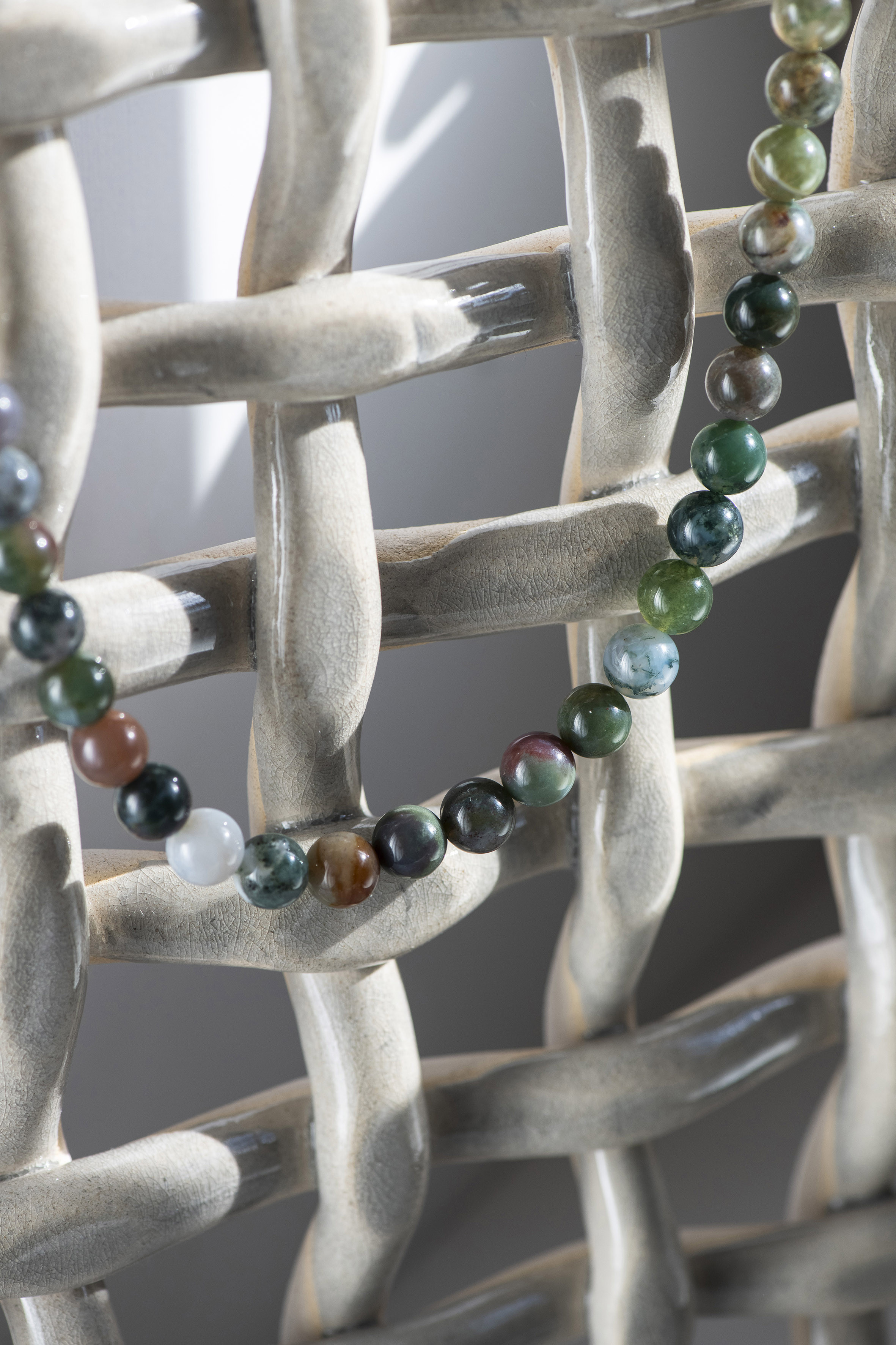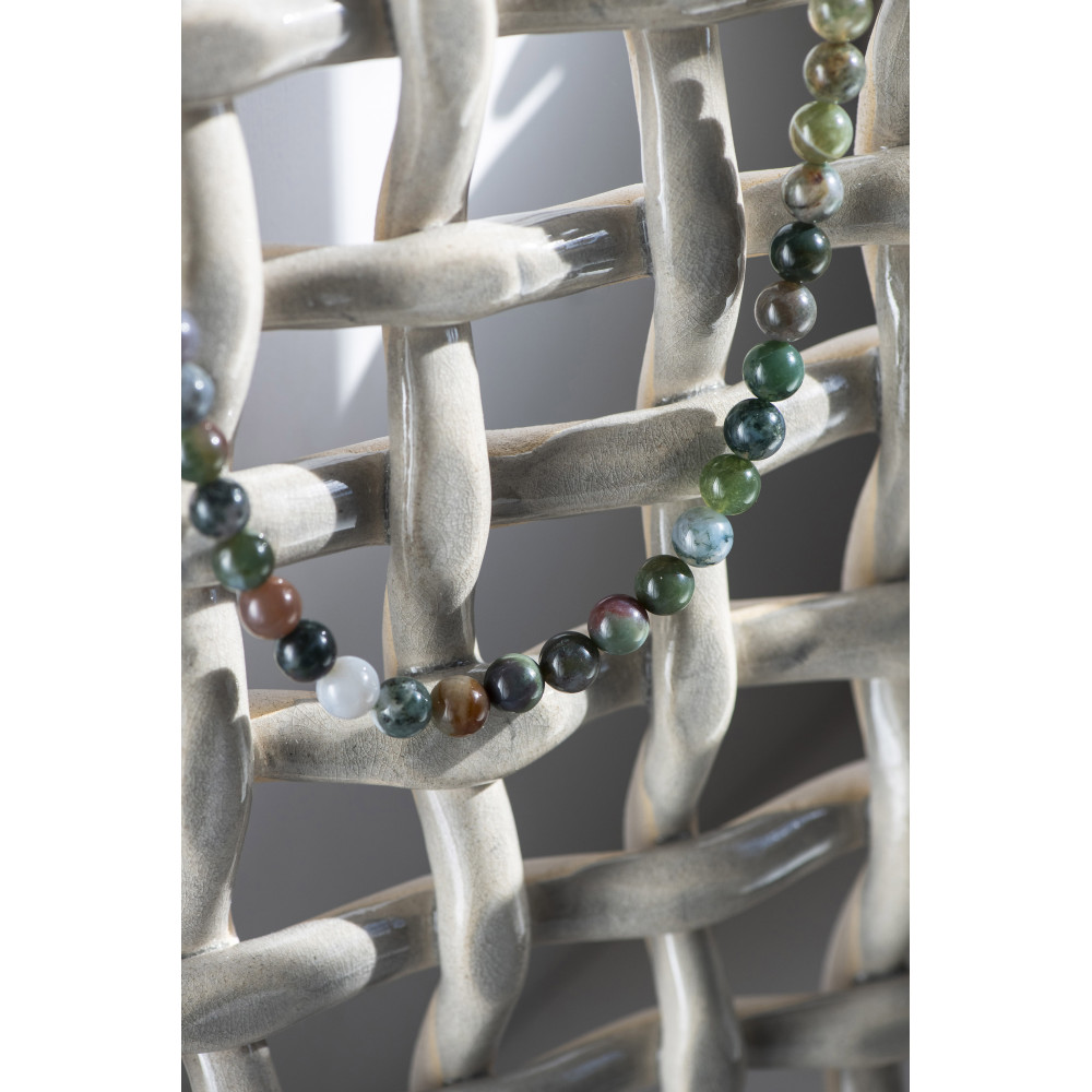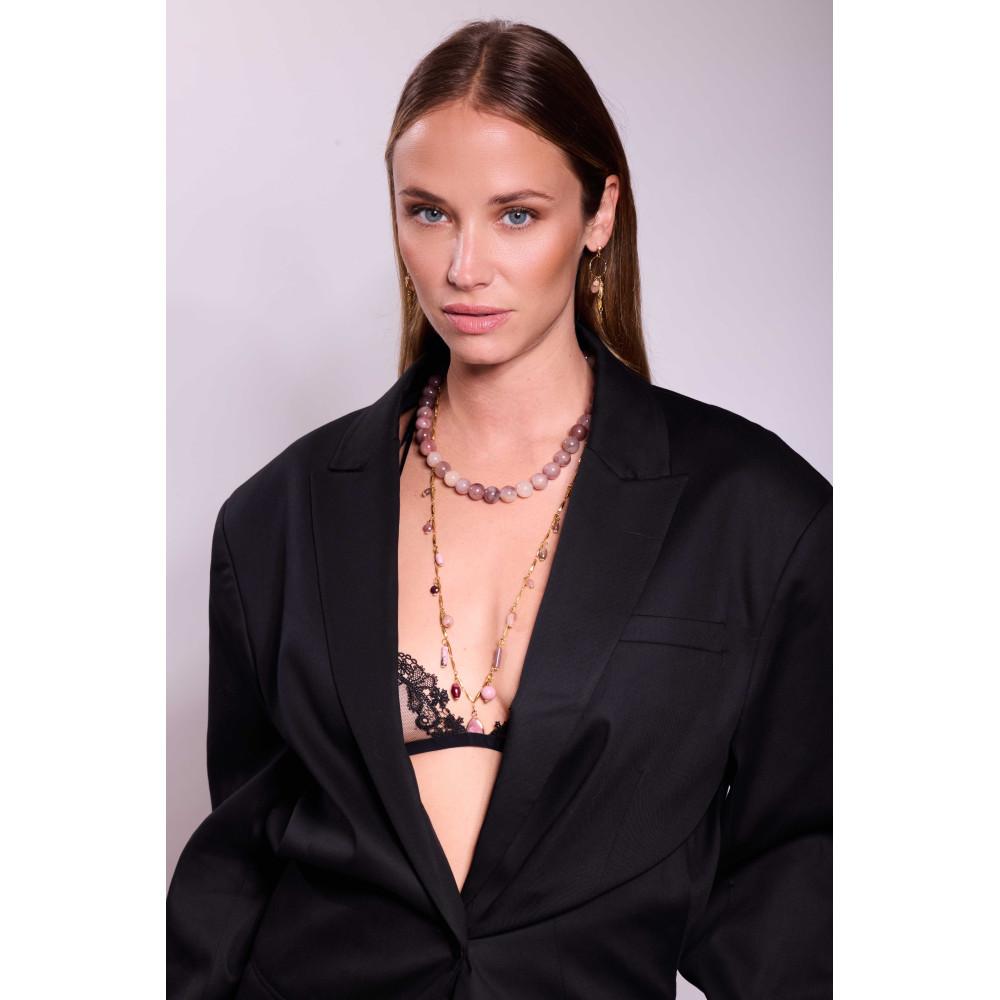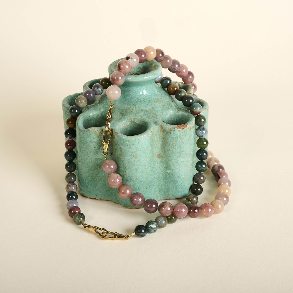 Le collier Boqi se distingue par son allure moderne et ses nuances vibrantes. Il se compose de perles aux tons verts et roses, subtilement assorties pour créer un équilibre harmonieux entre fraîcheur et douceur.