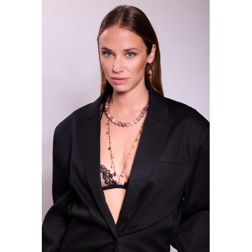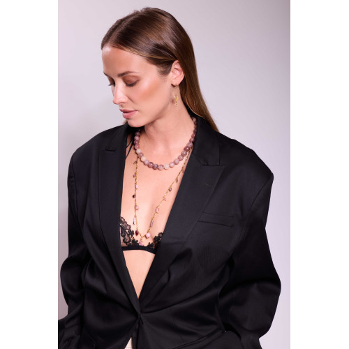 D’une longueur de 46 cm, il se ferme grâce à deux grands mousquetons, apportant une touche contemporaine et audacieuse à son design.