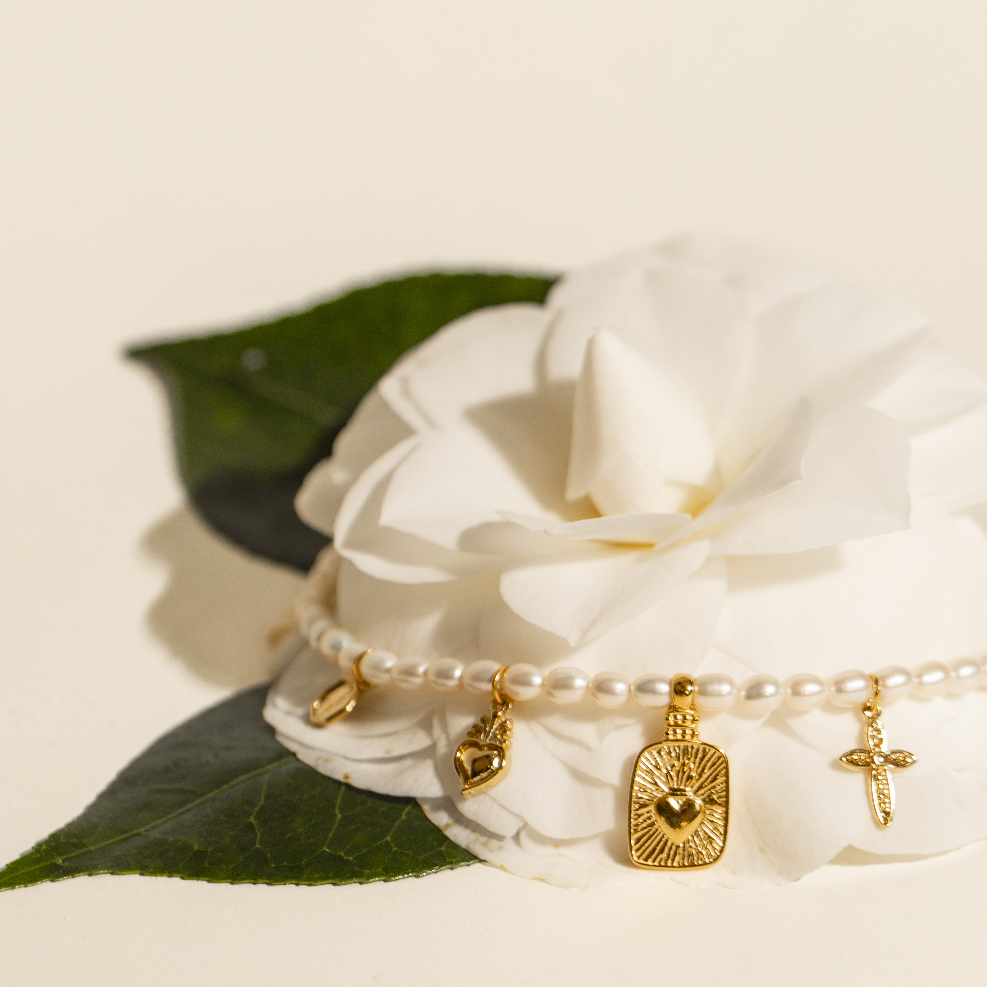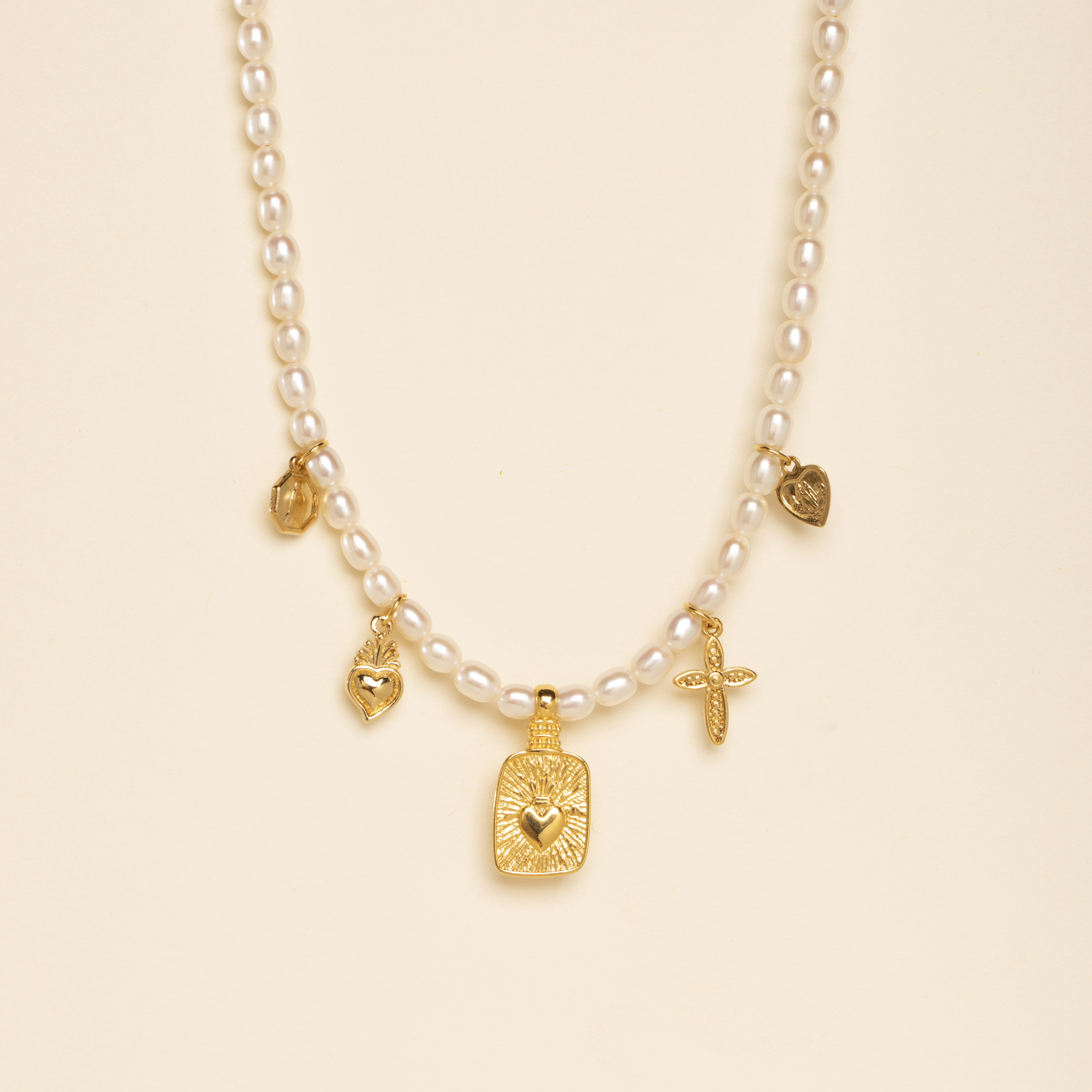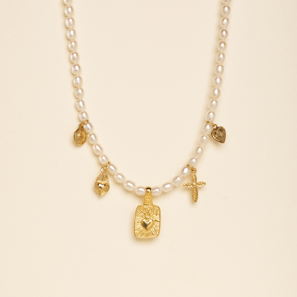 Le collier Isla se compose de perles de culture agrémentées de différentes pampilles protectrices dorées : Sainte Sara, ex-voto, croix.